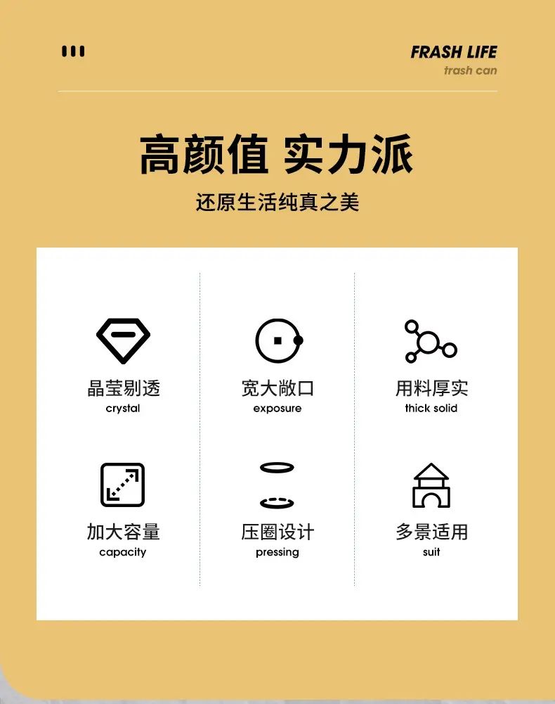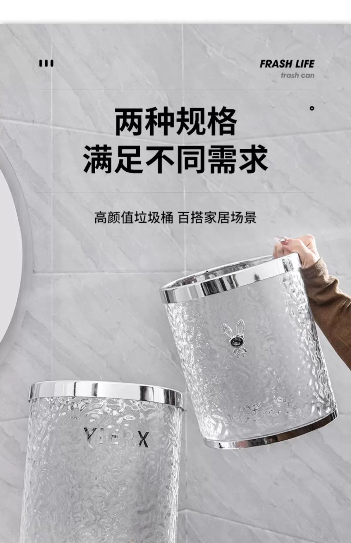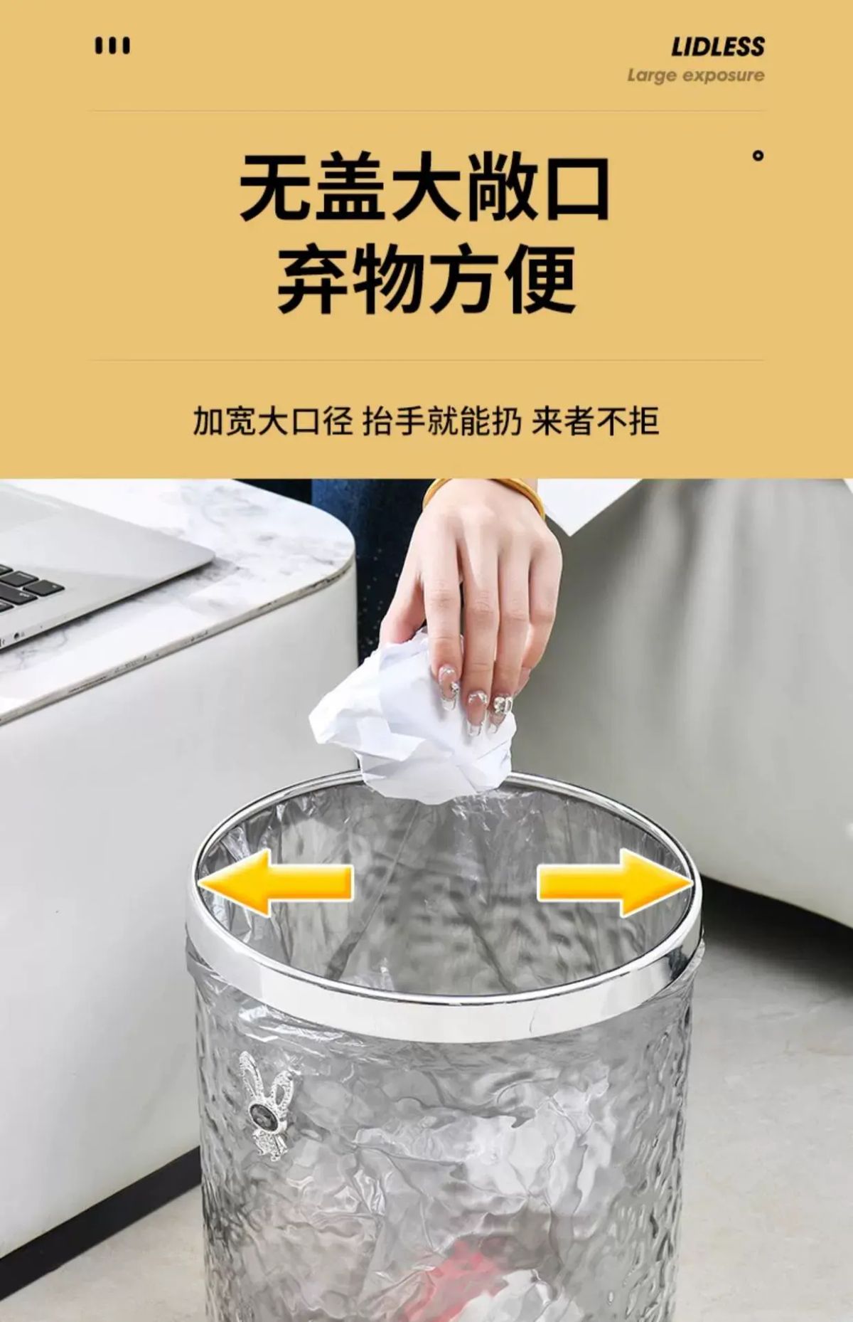 Description This trash can is a true beauty statement in your home! Its luxurious, transparent appearance adds a stylish touch to any space. Its large capacity easily accommodates even the heaviest kitchen waste. Suitable for living rooms, bathrooms, and toilets, it's moisture-resistant, durable, and easy to clean. It's both practical and enhances your home's aesthetic, making trash disposal a joy.
