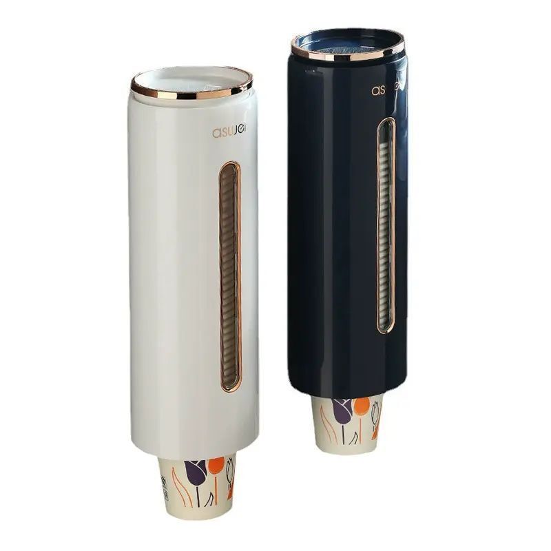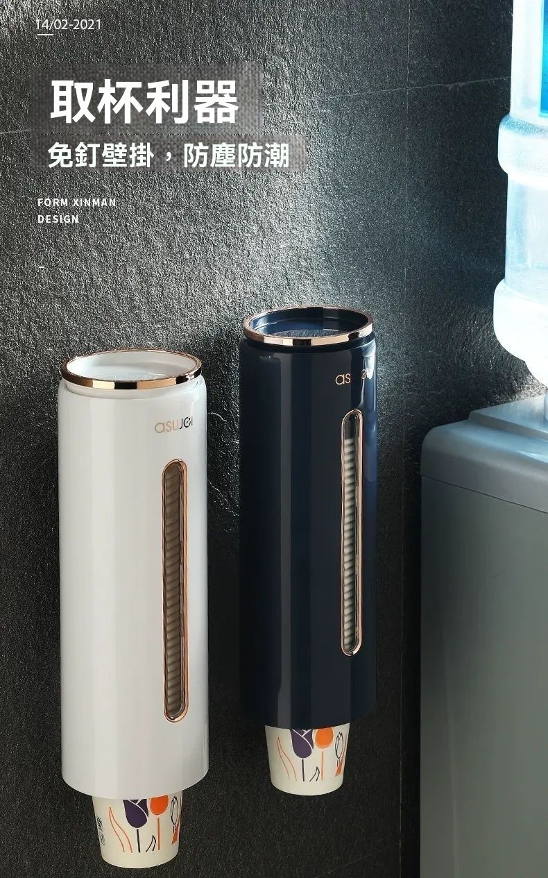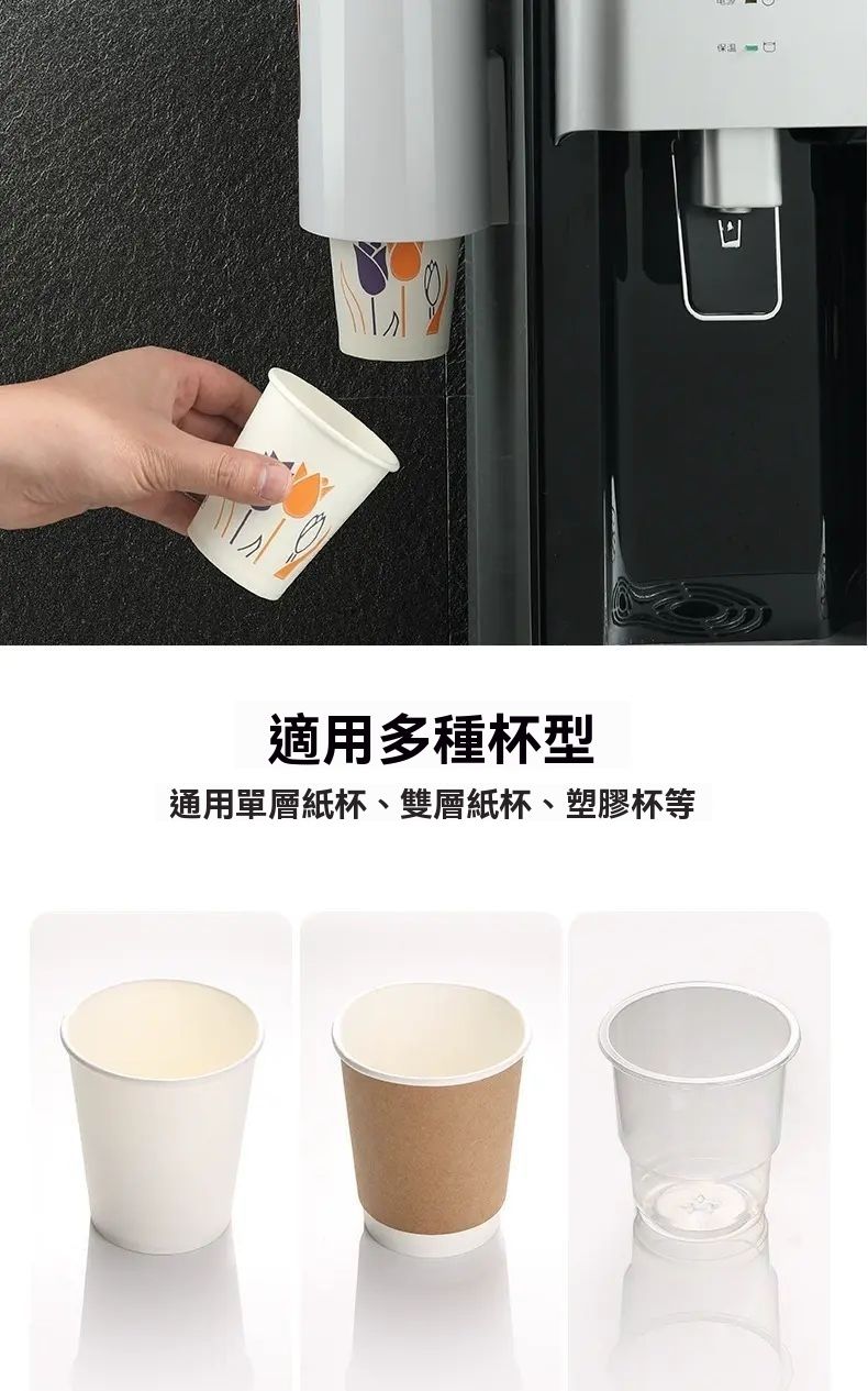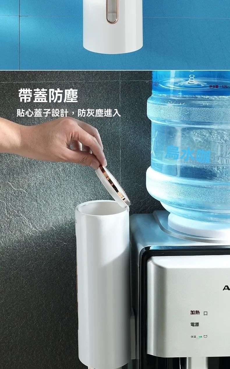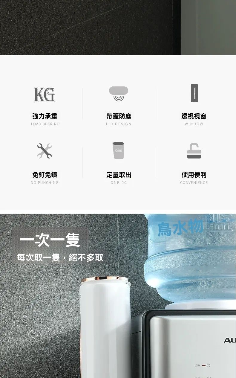 Patented cup drop structure, the cup drops as soon as it is taken out, easy to operate with one hand, and more efficient drinking. Large storage capacity, neatly store paper cups, dustproof and moisture-proof, more hygienic. The top storage platform can hold small items such as coffee powder bags. Strong suction cup or buckle design, firmly fits next to the water dispenser or on the desktop.