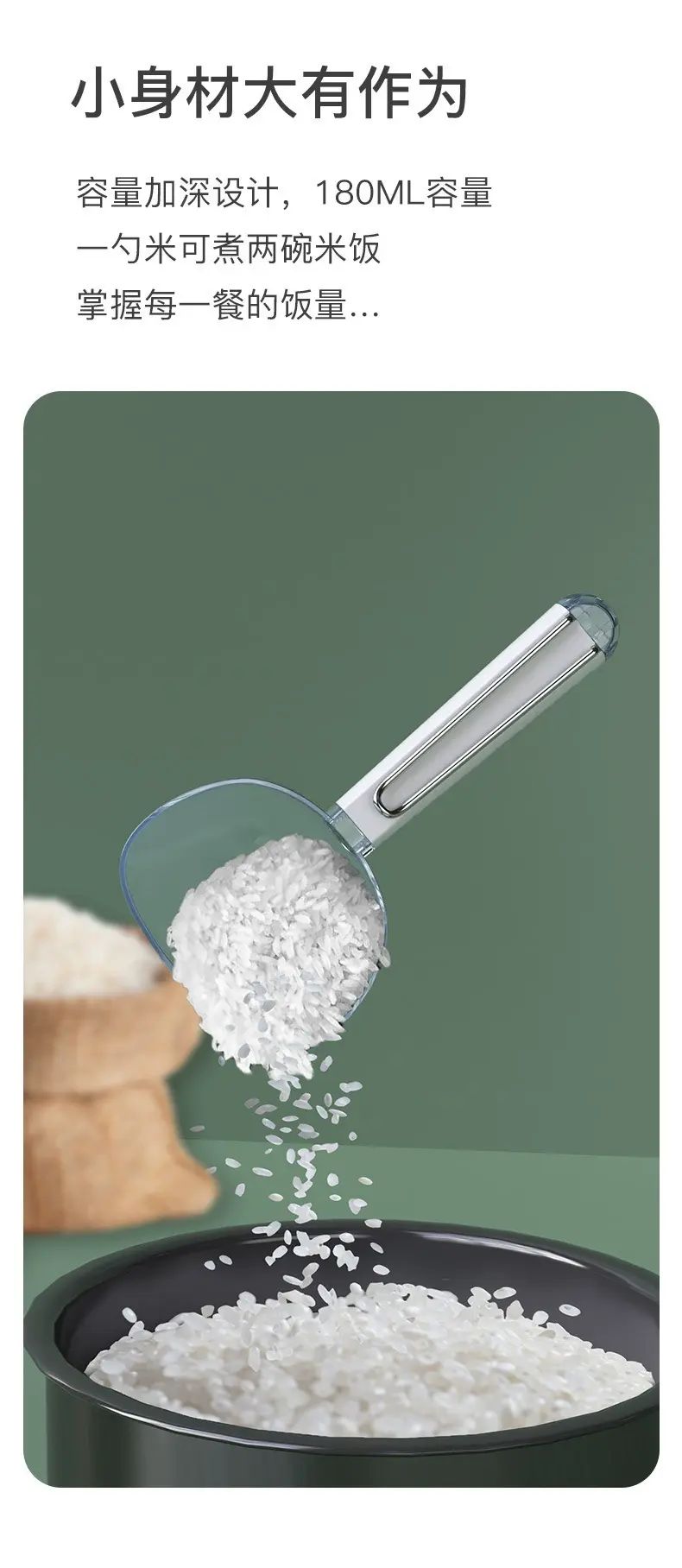 Description This multifunctional rice scoop is a practical little kitchen helper! It's versatile enough to scoop rice, scoop noodles, and scoop flour with ease. It comes with a built-in sealing clip for easy closure after scooping, effectively preventing moisture and preserving freshness. It also features a precise measuring function to meet diverse cooking needs. Made of high-quality materials, it's safe and durable, making it a great addition to any kitchen.