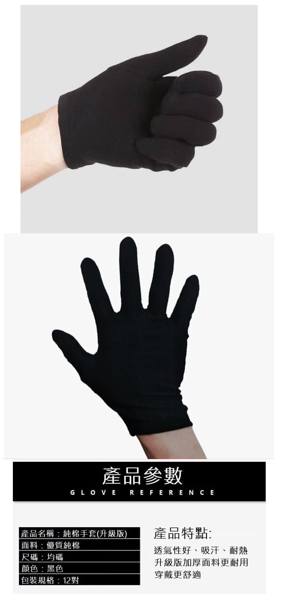 Description (12對裝)黑色純棉手套 黑色加厚款 均碼 #(KFF)