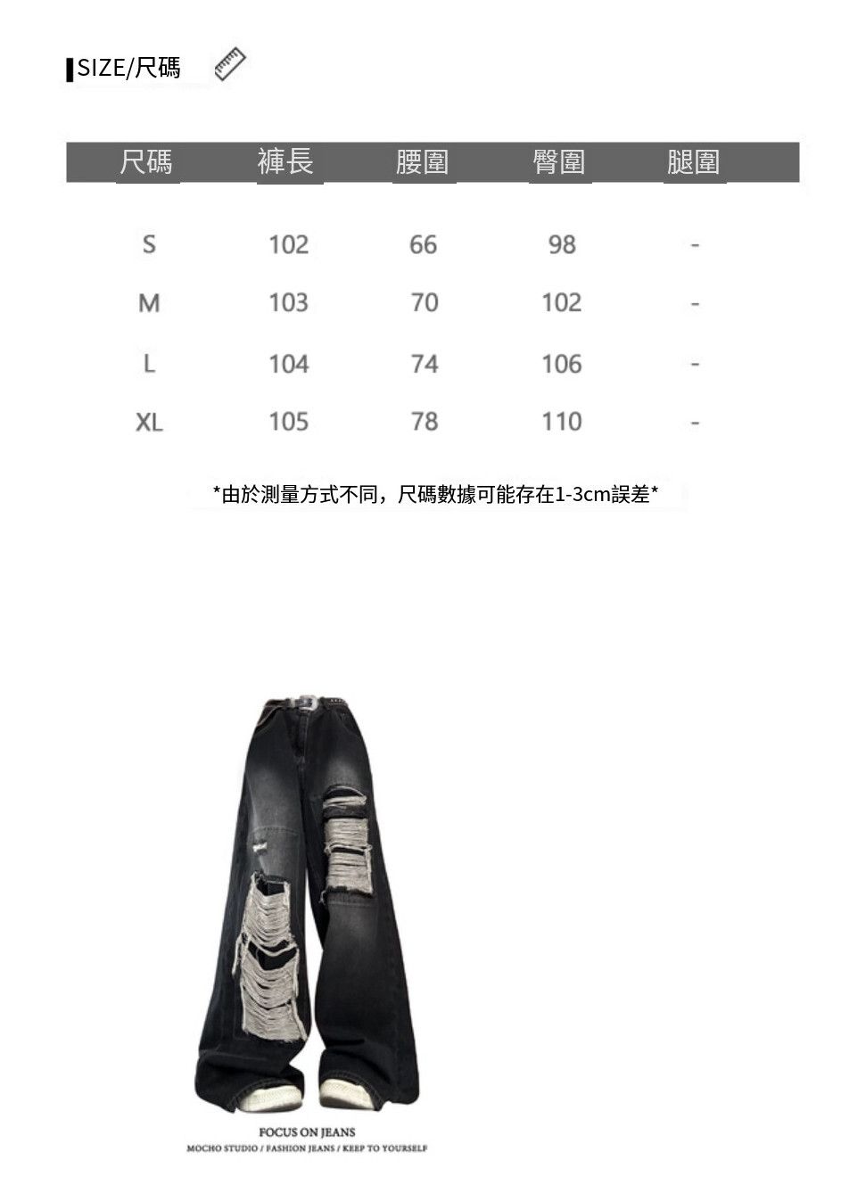 破洞牛仔褲【黑色】尺碼【S碼-XL碼】【下單後請聯絡客服確認發貨尺碼】