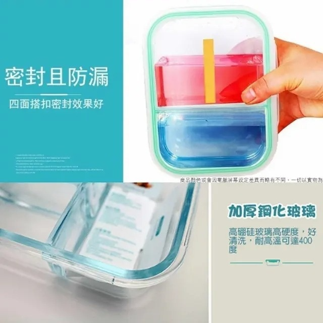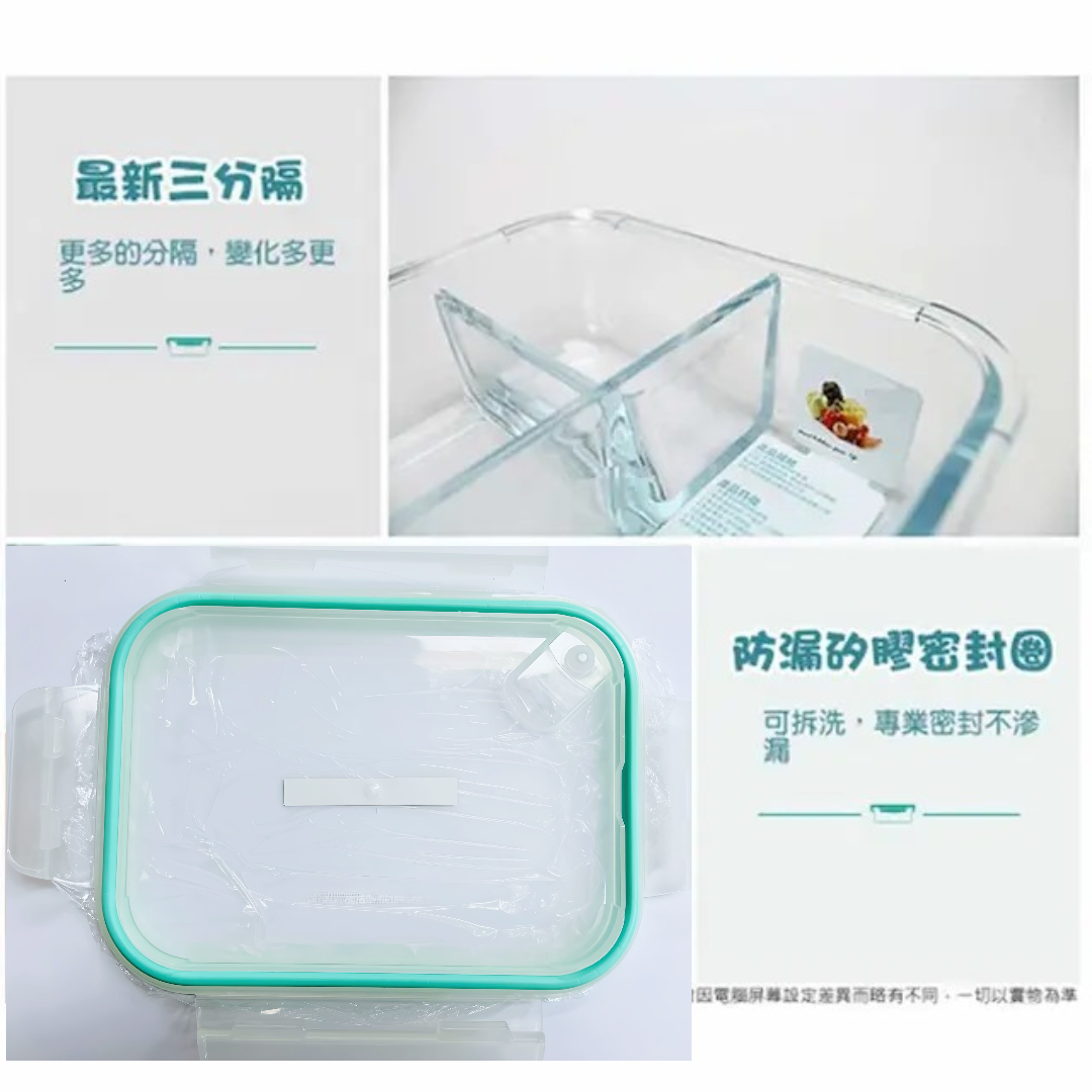 Made of quality toughened glass, maximum heat resistance is up to 400℃; cold -20℃ Leak-proof lid provides an airtight seal to keep food fresh longer Keeps contents from spilling even during transit Size: 1010ML, 3-slot: 19.5 x 14.5 x 6.2 cm ± 5% Material: Borosilicate glass, PP, silicone band Max. heat resistance 400℃; Max. cold resistance -20℃