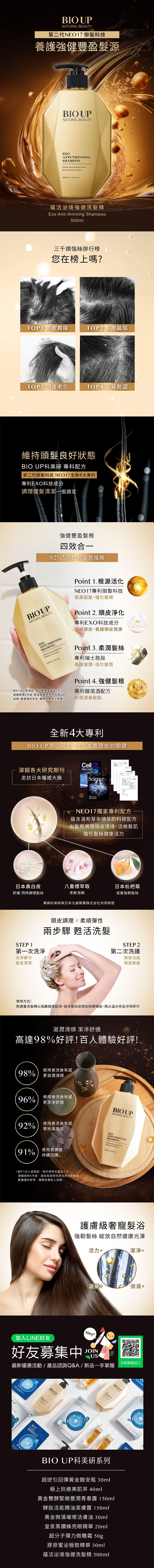 EXO+Black Peptide+NEO17+Cocktail 4 patents for voluminous & shiny hair Nourish hair from the scalp, restore shine, designed for fine & thin hair, enjoy a high-value hair care experience Infused with 63x hair growth code: patented EXO technology & Swiss Black Peptide —Patented EXO technology: 1/1000 pore size, penetrates follicles, Science journal: miR-218-5p promotes hair regeneration, one "nutrition" supplement restores 90% of hair loss areas