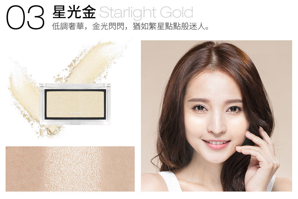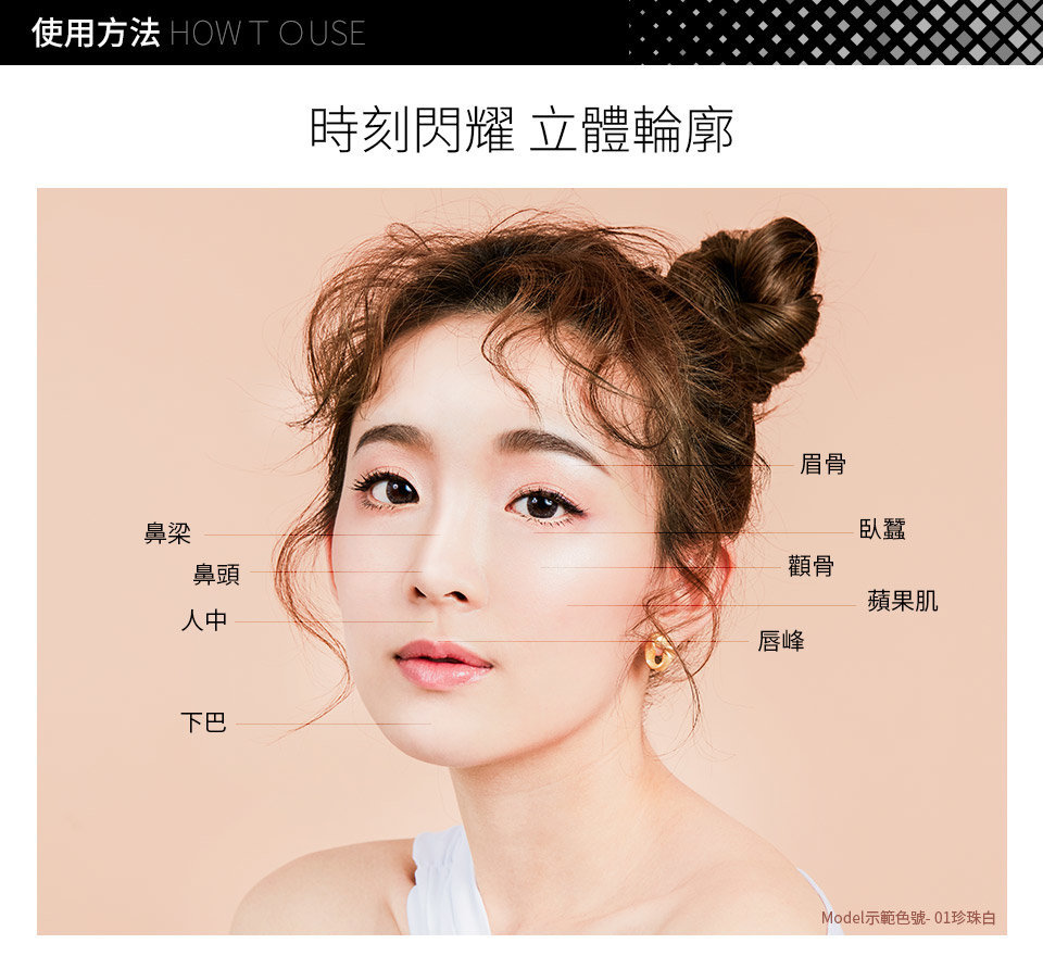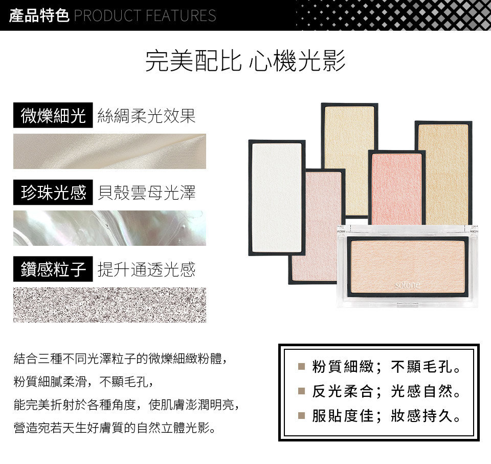 | Description | * 結合三種不同光澤粒子的微爍細緻粉體,粉質細膩柔滑,不顯毛孔,能完美折射於各種角度,使肌膚澎潤明亮,營造宛若天生好膚質的自然立體光影。 |