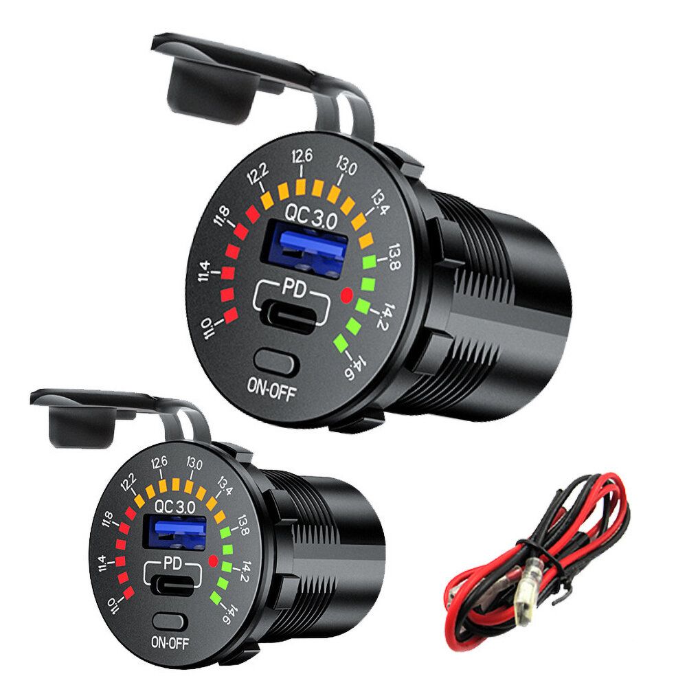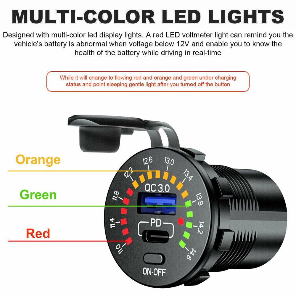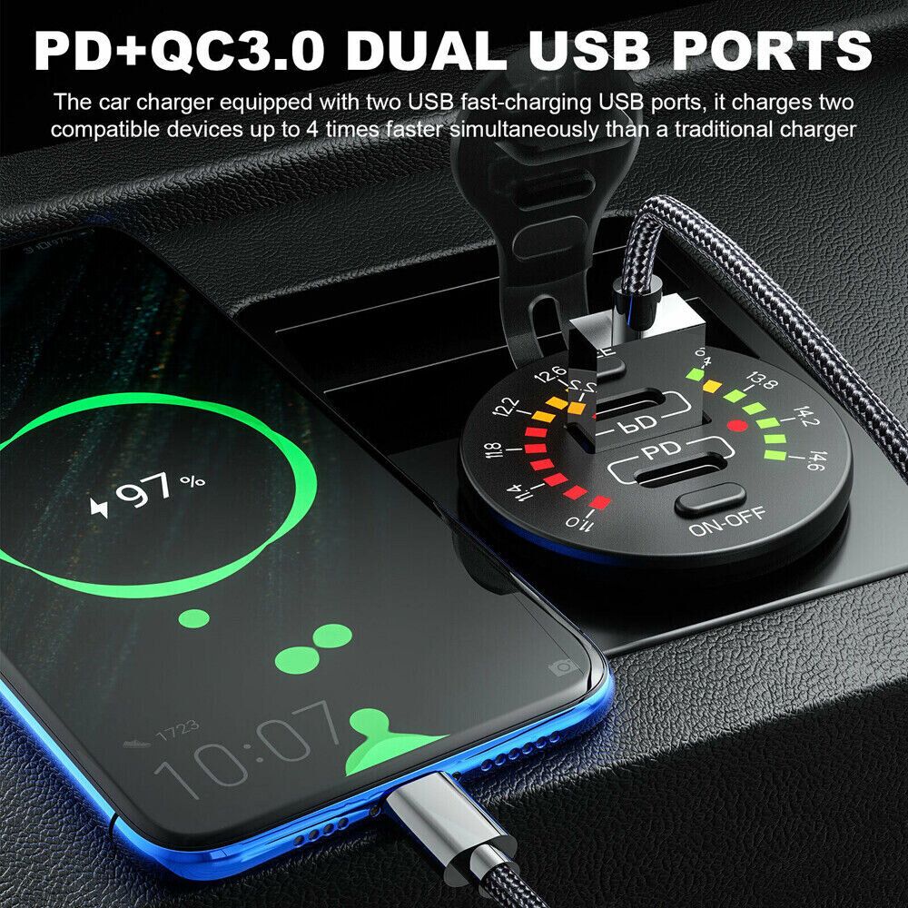 Intelligent fast charger with voltage display, high voltage warning, charging rate can be displayed Suitable for mobile phones, tablets, GPS and other USB devices. Color: Black Input voltage: DC 12-24V Output:5V 4.8A or QC3.0 & PD (optional) Size: 50x36.8x29mm Package list: 1x Charger 1x Connecting Cable |
