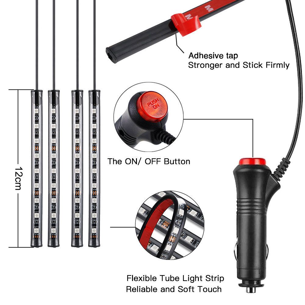7 Light Colors: Red, Green, Blue, Purple, Aqua, Yellow and White LED Light Length: 12cm Width: 1.5cm Strip light Cable Length: 2 x 120cm + 2 x 170cm Number of LED: 9 LED x 4 Voltage: DC 12V Modes: 4 color changing modes and 4 sound- activated color changing modes |