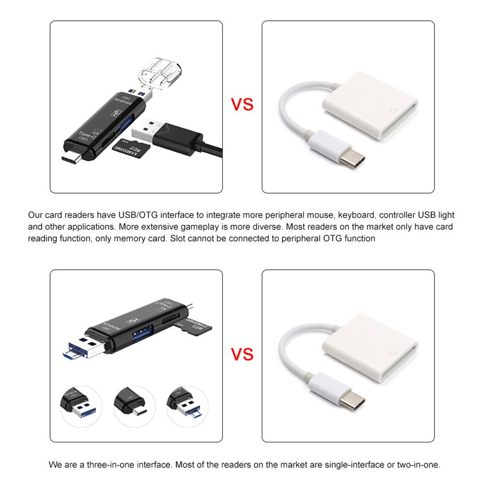 Color: Black / White Material: ABS environmentally friendly materials Compatible With Multi-systems: supports Micro / Usb / Type-c / TF Product Size: about 7.3 x 1 x 0.9cm Package included: 1pc Type-c 5-in-1 OTG card reader |