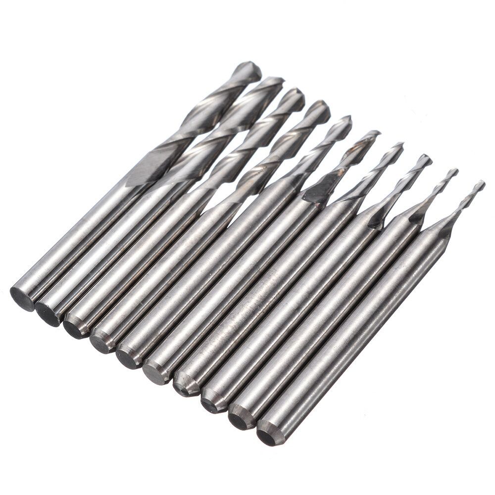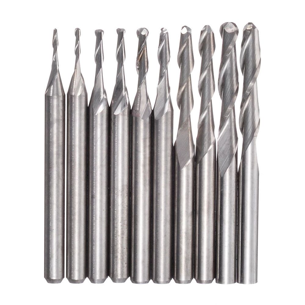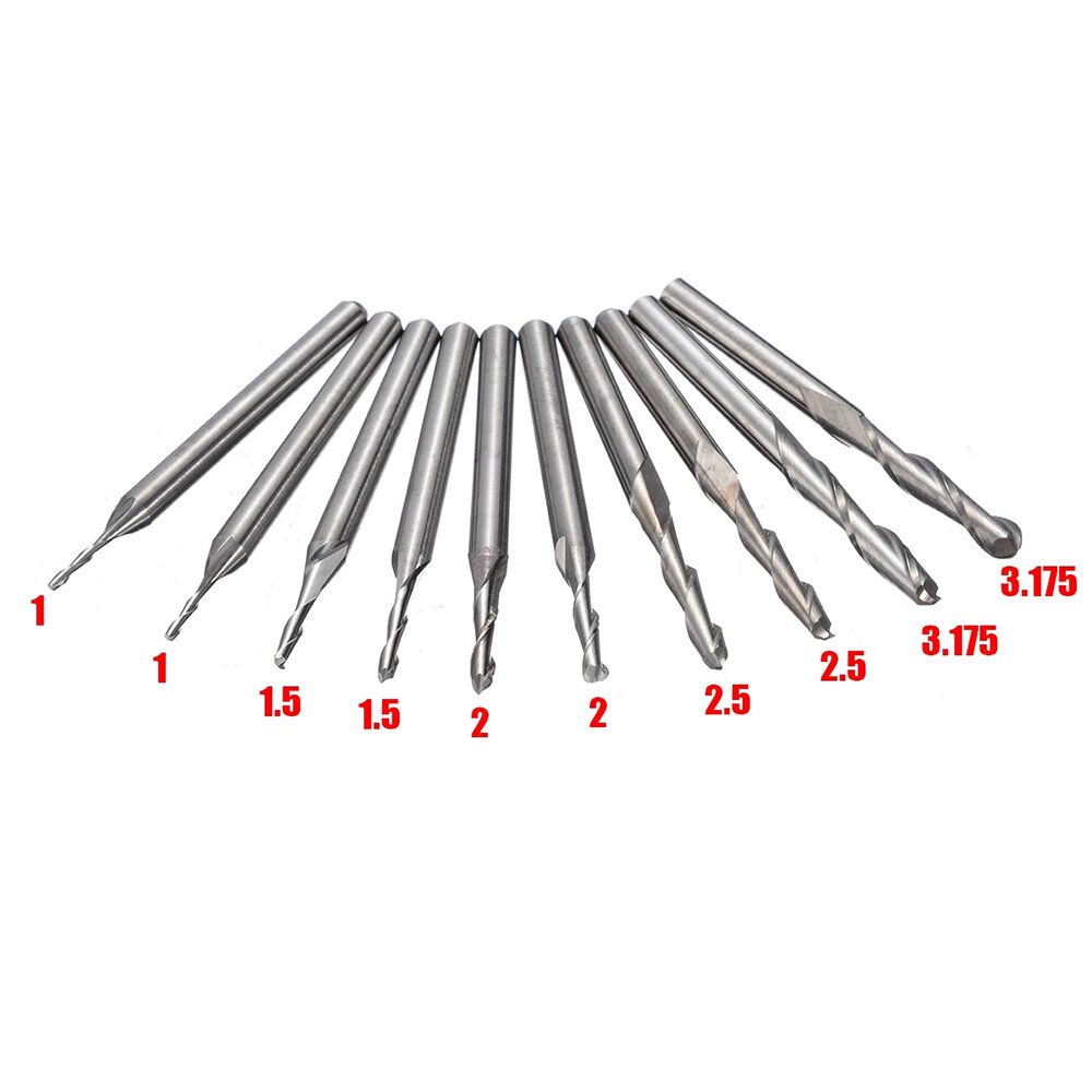 Coating: Uncoated Cutting diameter: 1/1.5/2/2.5/3.175mm (each Size 2pcs) Package Included: 10 x Ball Nose End Mill Drill Bits |