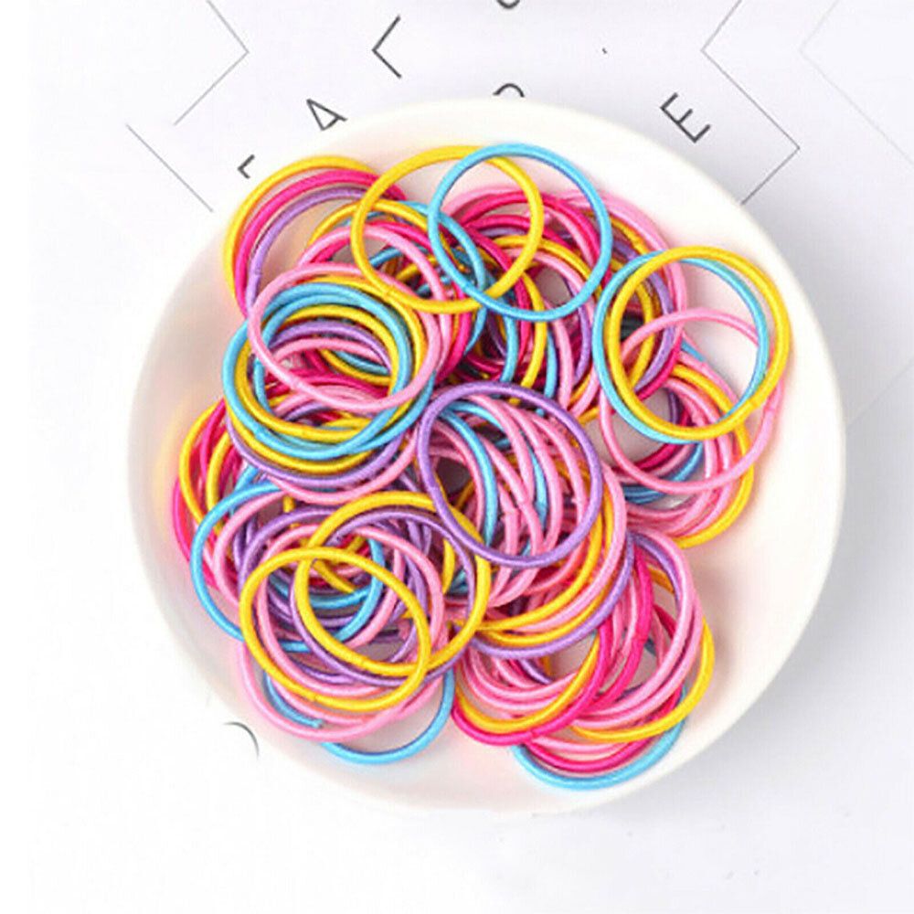 Material:Nylon Color: Colourful Size: The outer diameter of the hair circle: 3cm (approx) The length of the rubber band: 9cm (approx) The thickness of the rubber band: 2mm (approx) Package Included: 100pcs Hair Ties |
