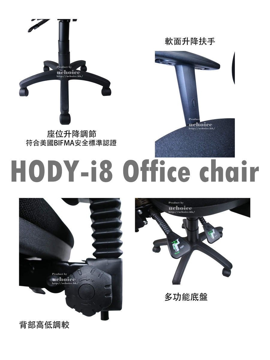 座位升降調節、軟面升降扶手、椅背高低調較、背部多角度鎖定功能、符合美國BIFMA安全標準認證.