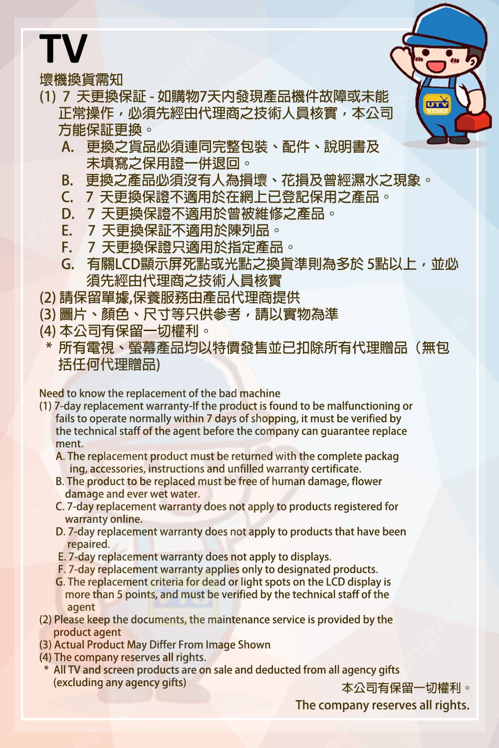 1) All products are covered by the agent's maintenance service. You must retain the original HKTVMALL purchase receipt, which can be downloaded from your "Order History".