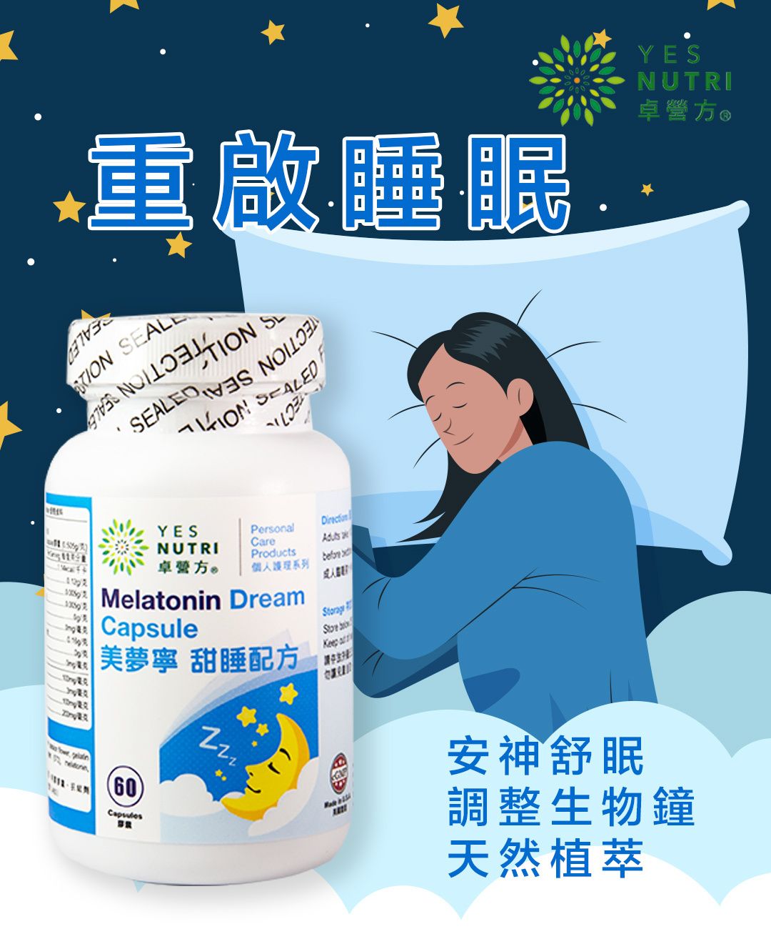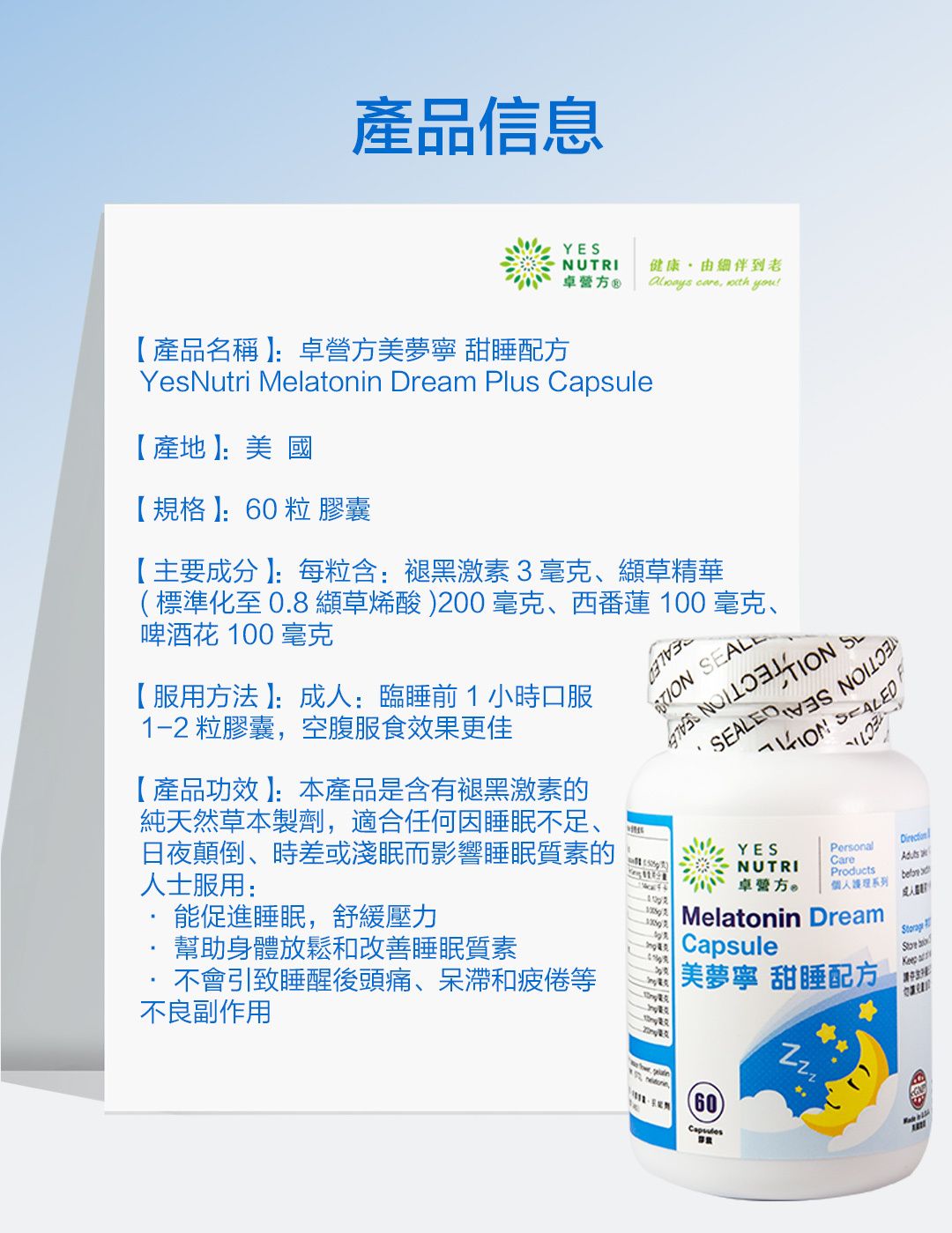 ♻ YesNutri will gradually eliminate the outer package of our products in promoting environmental protection.→ Promote sleep and improve quality → Relax and soothe tension → Assist in adapting jetlag or shiftwork → Do not cause headache or hangover effect |