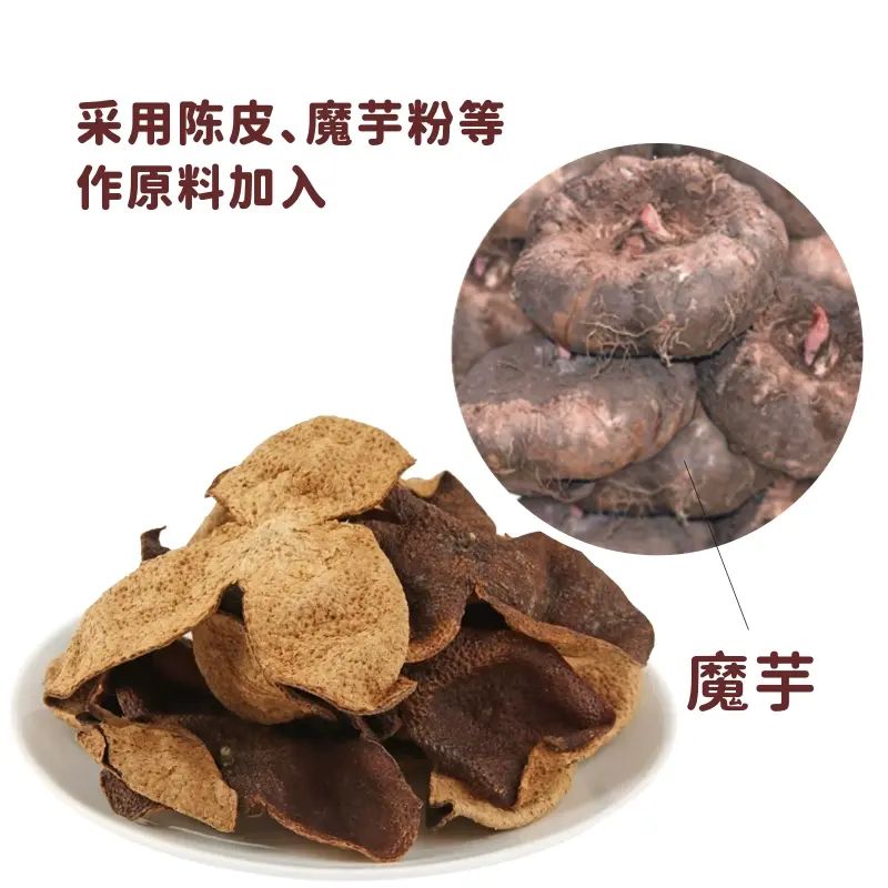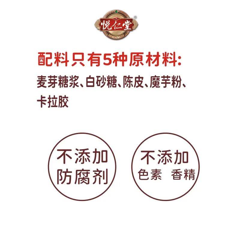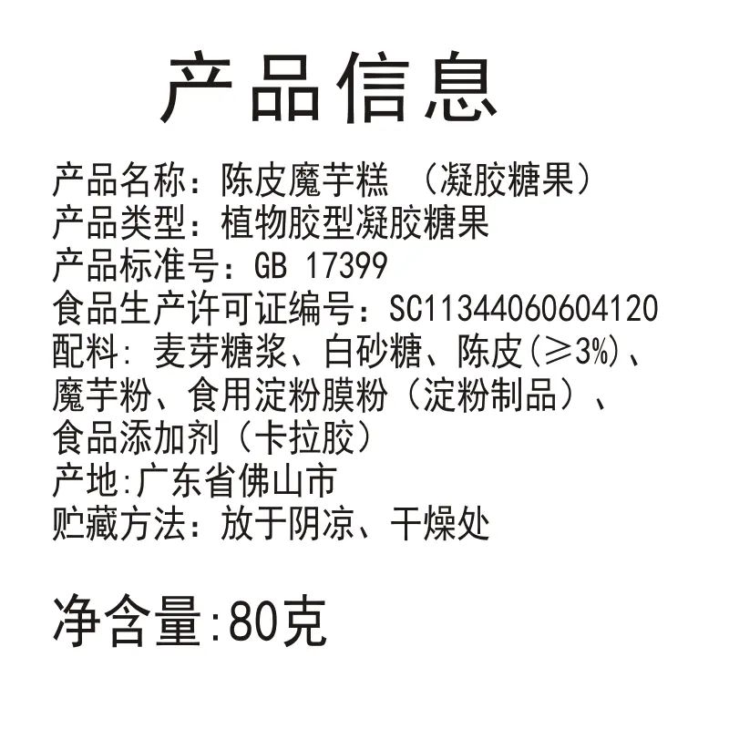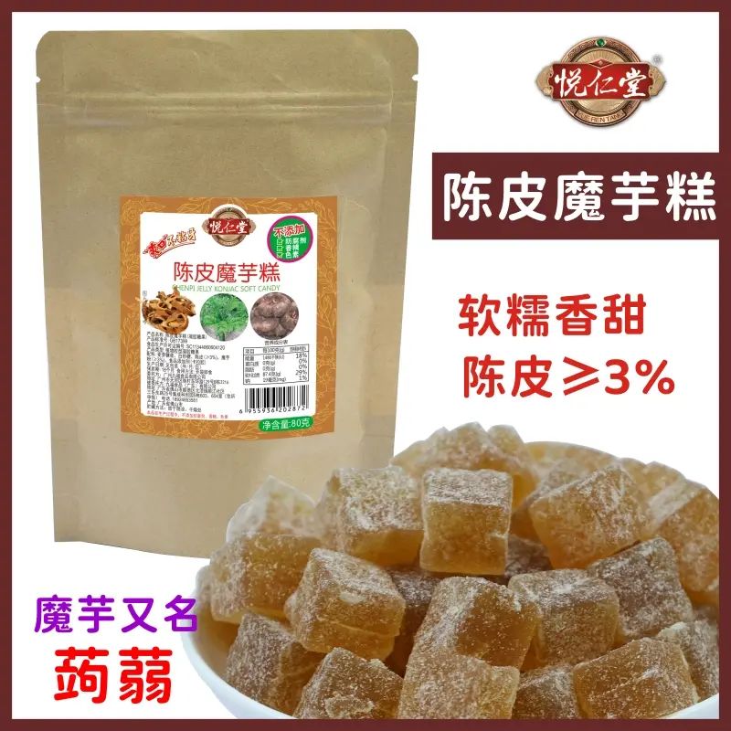 Yuaren Tang Tangerine Peel Konjac Cake is carefully made with konjac (also known as蒟蒻). The ingredient list is clean. Tangerine peel is crushed and added, with no preservatives or colorings; it has a plant-based gel texture and is fat-free. It tastes good, doesn't stick to teeth, and is healthy and safe.