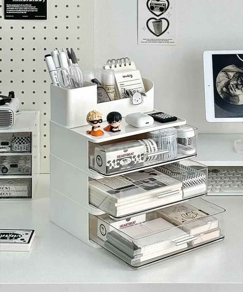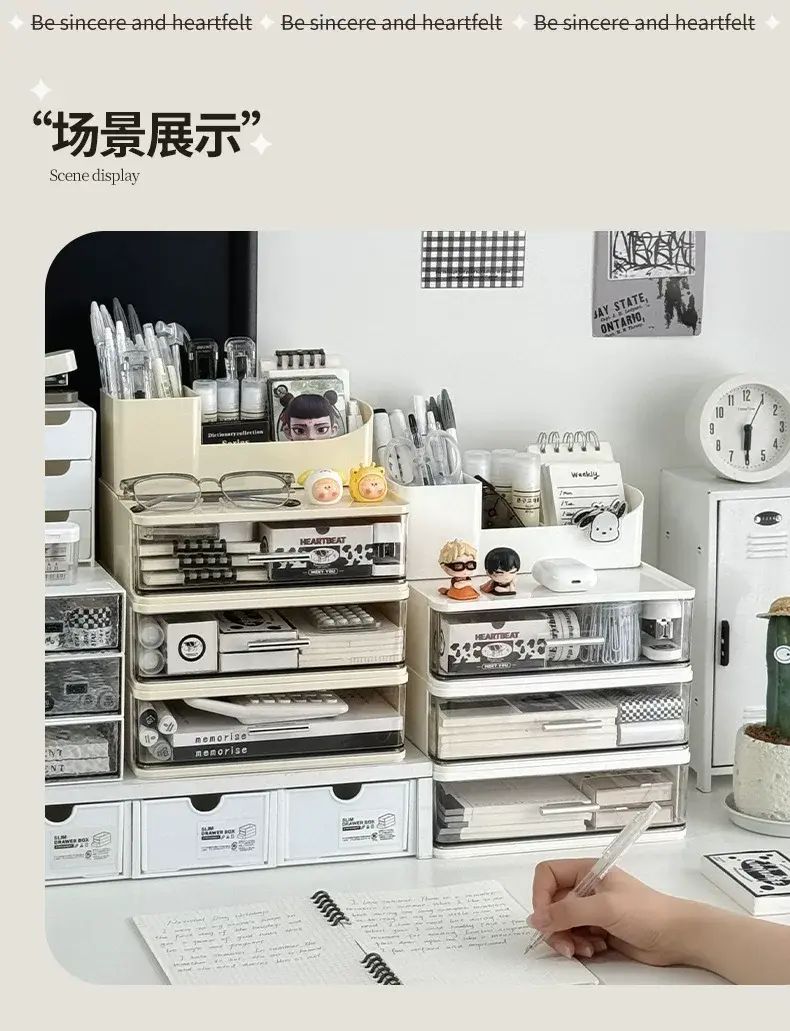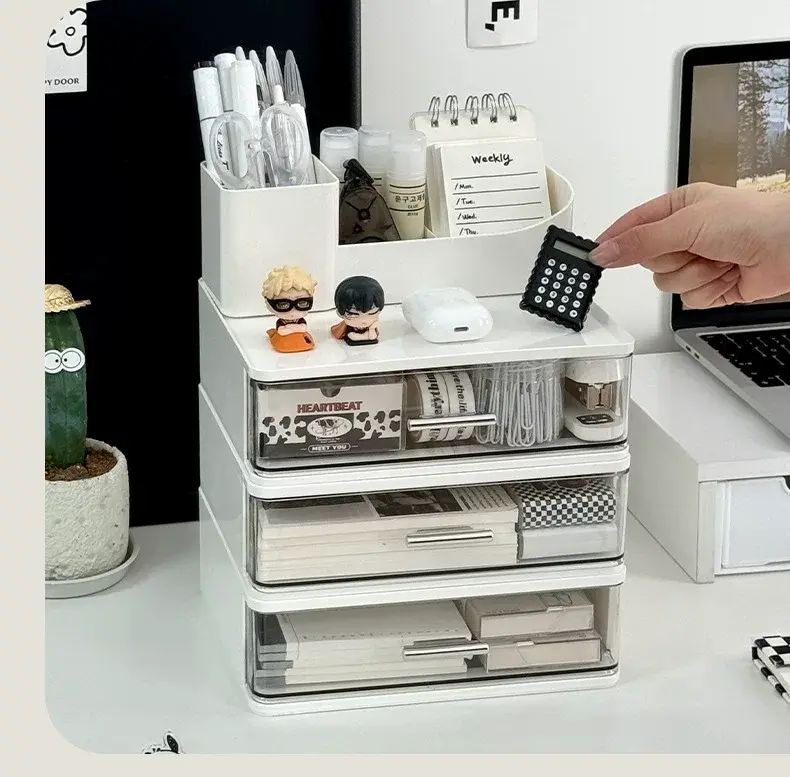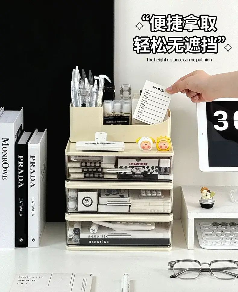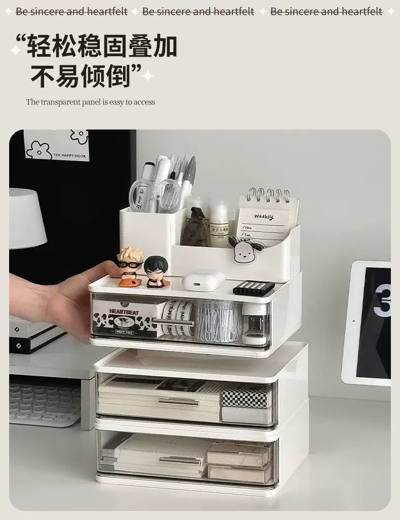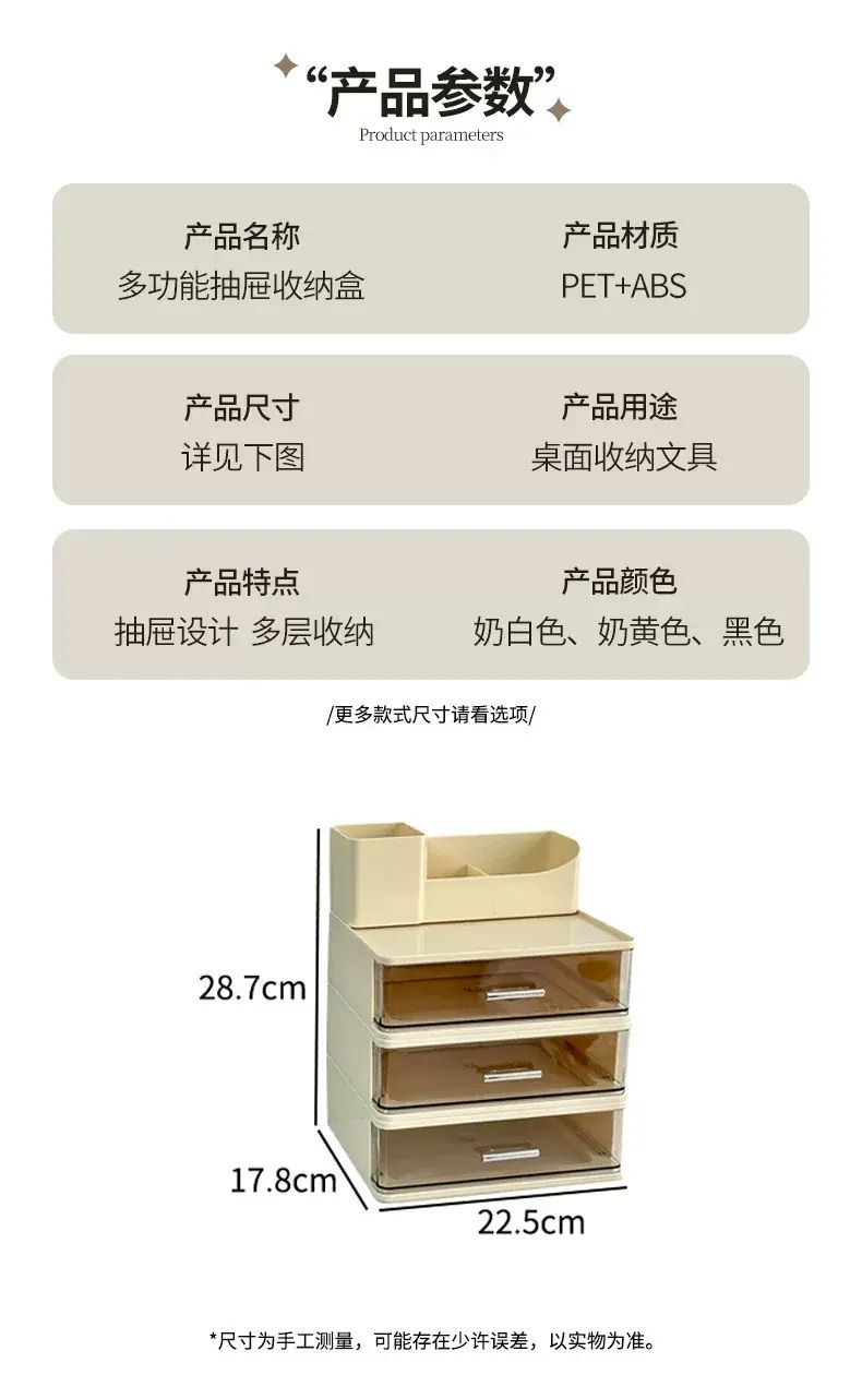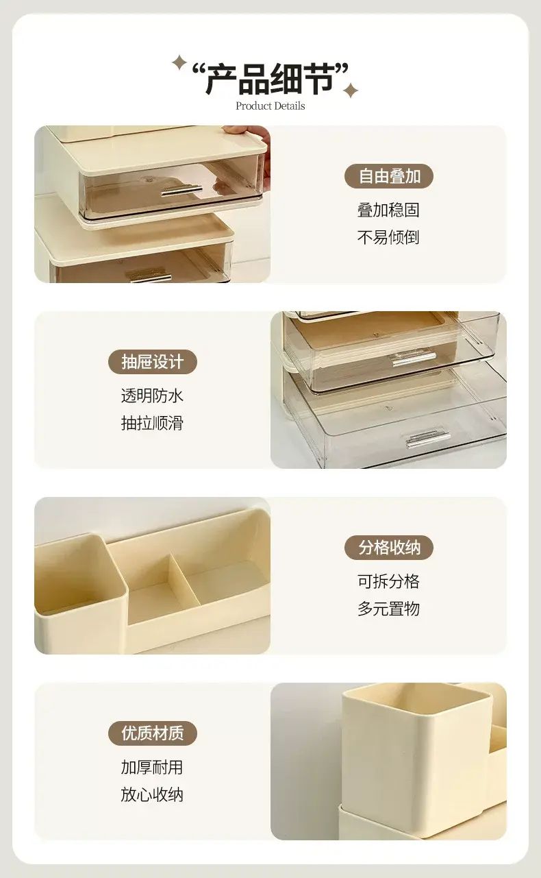 商品簡介 化妝品收納盒桌面抽屜式防塵整理盒宿舍梳粧檯護膚品化妝刷置物架;奶色三層組合收納盒