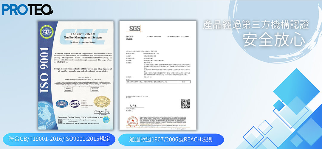 PROTEQ 是一家專注於改善生活品質的品牌,主要生產及銷售空氣過濾器和智能家居設備。產品所有過濾介質經過SGS測試,符合歐盟第1907/2006號REACH法規,並有ISO9001工廠質量管理證書。廠房設有實驗室,測試各濾網風阻及品質。客人可安心購買使用。