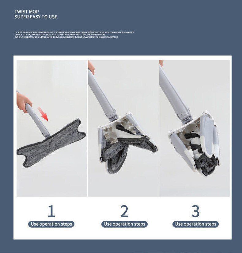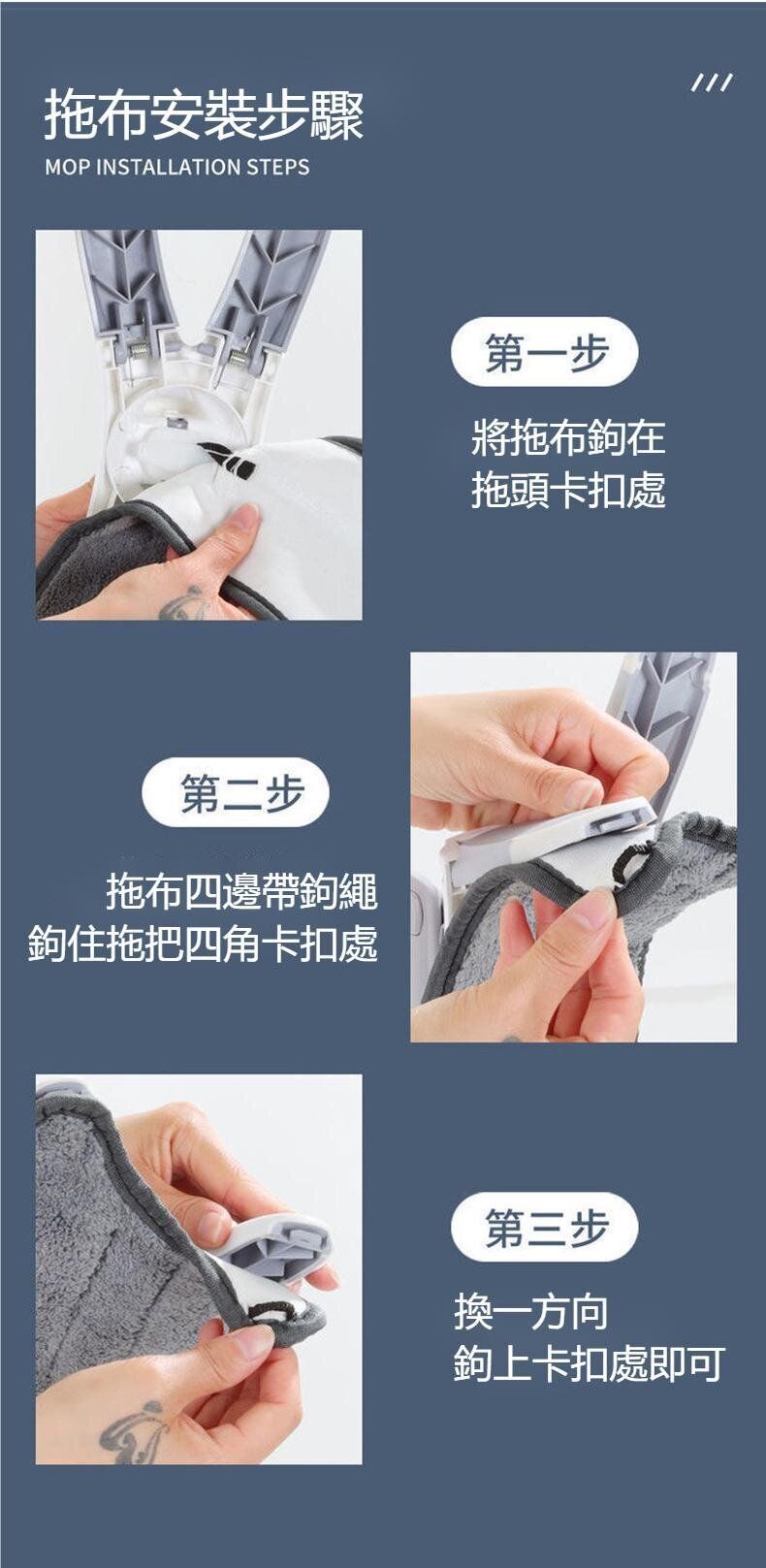 仿手擰平板拖把,無需手洗,除塵吸水,為您的家人帶來清新無塵的環境 拖地乾淨,簡單好用 37cm大平板拖把,拖得快 厚實拖布,多層吸水層,可乾拖,可濕拖,清理家中多種污漬 升級仿手擰,脫水容易免手洗,清潔不髒手,適用於各種地板、瓷磚 拖布安裝步驟:將拖布鉤在拖頭卡扣處,拖布四邊帶鉤繩,鉤住拖把四角卡扣處,換一方向鉤上卡扣處即可 尺寸:37x15x130cm |