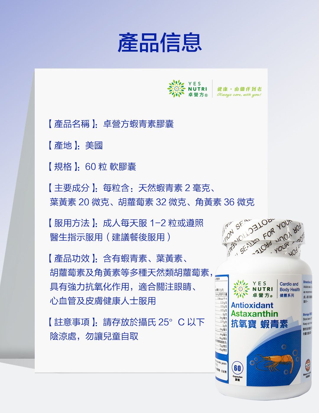 ♻為環保出分力,由即日起,卓營方產品陸續改用沒有外盒的包裝出售! → 強力抗氧化 → 促進皮膚健康 → 促進心臟、心血管及肝臟健康 → 增強免疫系統防護 → 有助維持眼睛健康,延緩視力老化 |