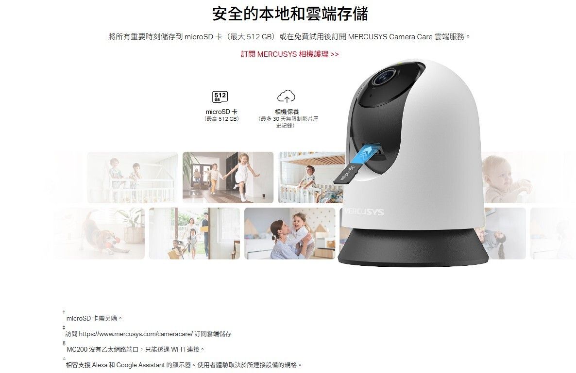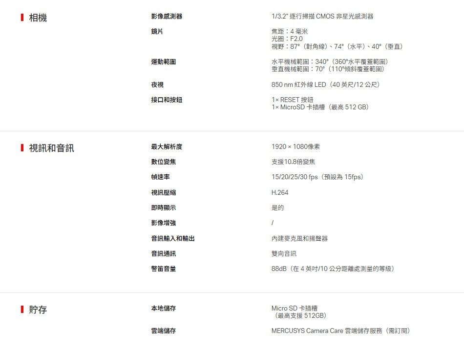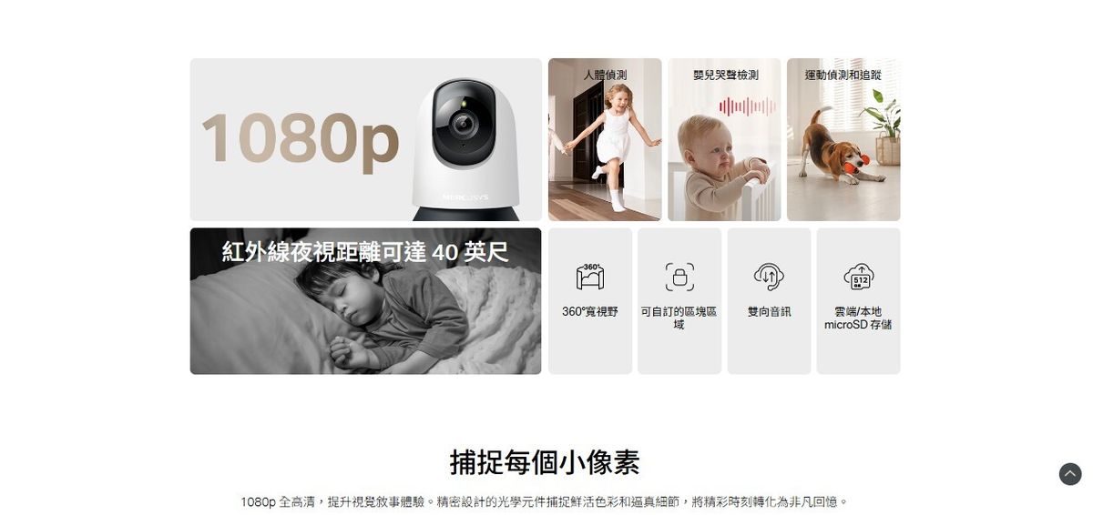🎥 1080p 高畫質影像:解析度高達 1920 × 1080 px,畫質細緻清晰。 🔄 360° 全方位旋轉:水平 340° + 垂直 70°,實現無死角監控。 🧠 AI 智慧偵測:全天候偵測人物、移動目標與嬰兒哭聲,並即時推播警報通知。 🌙 夜視功能強化:850nm 紅外線 LED,夜視距離最遠達 12 公尺,黑夜也清晰。 🗣️ 雙向語音通訊:內建麥克風與揚聲器,支援 88dB 警報音量,即時互動無障礙。 🔒 隱私保護設計:可自訂隱私區域,防止攝影機拍攝私人空間,保障居家隱私。 💾 儲存方式彈性:支援最高 512GB microSD 卡本地儲存,亦可訂閱 MERCUSYS Camera Care 雲端服務。 🗣️ 語音控制支援:相容 Google Assistant, Amazon Alexa,語音操控更便利。 🧩 安裝方式多元:可桌面擺放或吸頂安裝,靈活配置居家空間。 |