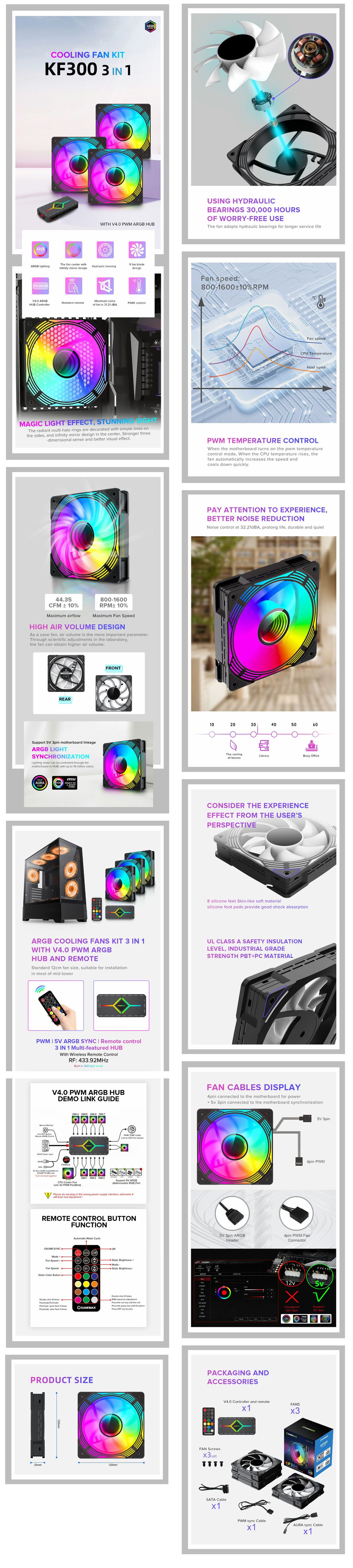 GameMax KF300 BK,120mm黑色框架ARGB風扇3合1套件,隨附高級V4.0 ARGB集線器和無線遙控器 - 高性能冷卻風扇,適用於PC機殼 |