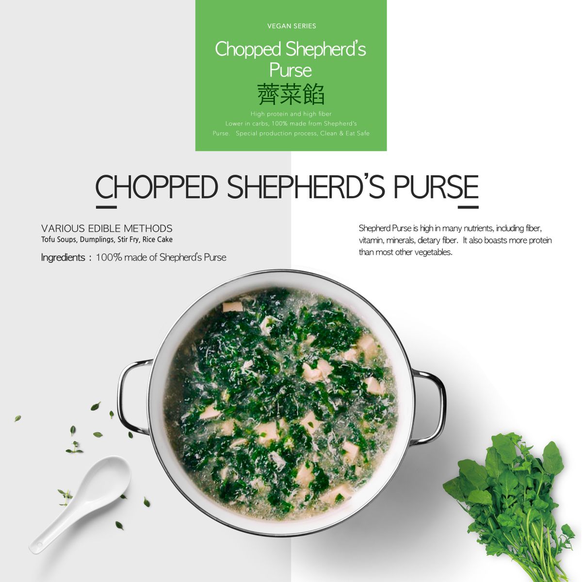 House of Health 薺菜餡 薺菜可以稱為野菜之王,其營養價值很高,高鈣且含豐富蛋白質、胡蘿蔔素和維生素B1、B2、B6、C等。 當中大量的粗纖維,可增强大腸蠕動,促進排泄,從而增進新陳代謝 💭 100% 新鮮薺菜制造 💭 產品經過漂燙殺菌,乾淨衛生 💭 特別處理技術速凍鎖鮮,保留其味道及營養價值 💭 省時方便,免洗免砌! 💭 無須解凍,直接烹調即可! 💭 經過特別生產工藝,產品不會大量出水! 💭 不含過敏原 / 人工香料 / 防腐劑 / 鹽 💭 ISO22000 及 HACCP 安全系統下生產,達國際食品安全級出口 此日期前最佳:2026年7月5日 新品上市:急凍毛豆仁 https://www.hktvmall.com/hktv/zh/main/營饌/s/H9730001/超級巿場/超級市場/冷凍-急凍食品/素食產品/急凍毛豆仁-500克-素食-毛豆-蔬菜-急凍18度/p/H9730001_S_HOH-121028A1 搜尋編號︰AS01171 |