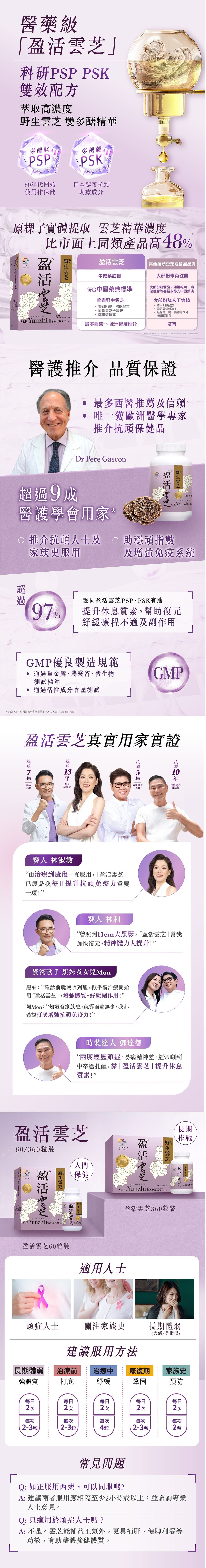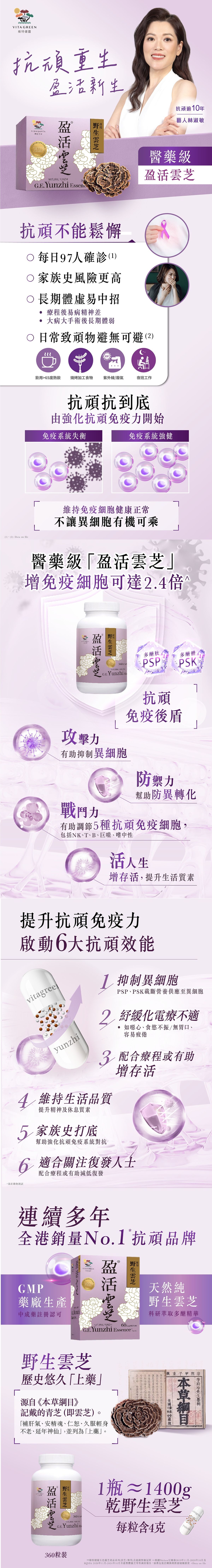 醫藥級「盈活雲芝」 純天然野生雲芝 純天然野生雲芝 科研萃取兩大提升抗頑免疫的雙多醣活性成分,雲芝多醣肽(PSP)及雲芝多醣體(PSK) 增免疫細胞可達2.4倍^ 紓緩化療電療等療程不適 有助抑制異細胞 配合療程或有助增存活 適合頑症、術後/頑後欲調理身體人士、家族史、長期體弱人士 ^Data on file |