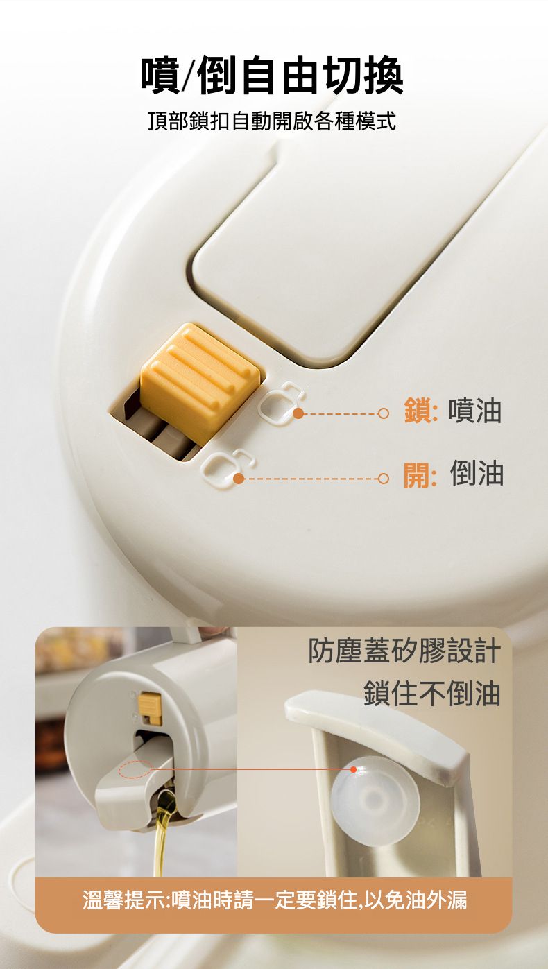 無論你是想噴油還是倒油,只需簡單切換就能實現。它的頂部鎖扣可以自動開啟各種模式,讓你的操作更加便捷。