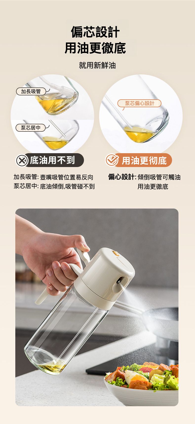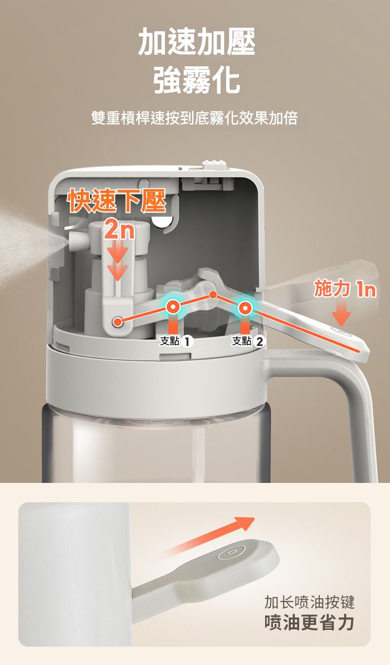 此款油壺的加速加壓設計和泵芯偏心設計,讓霧化效果加倍,並確保你使用油更徹底。