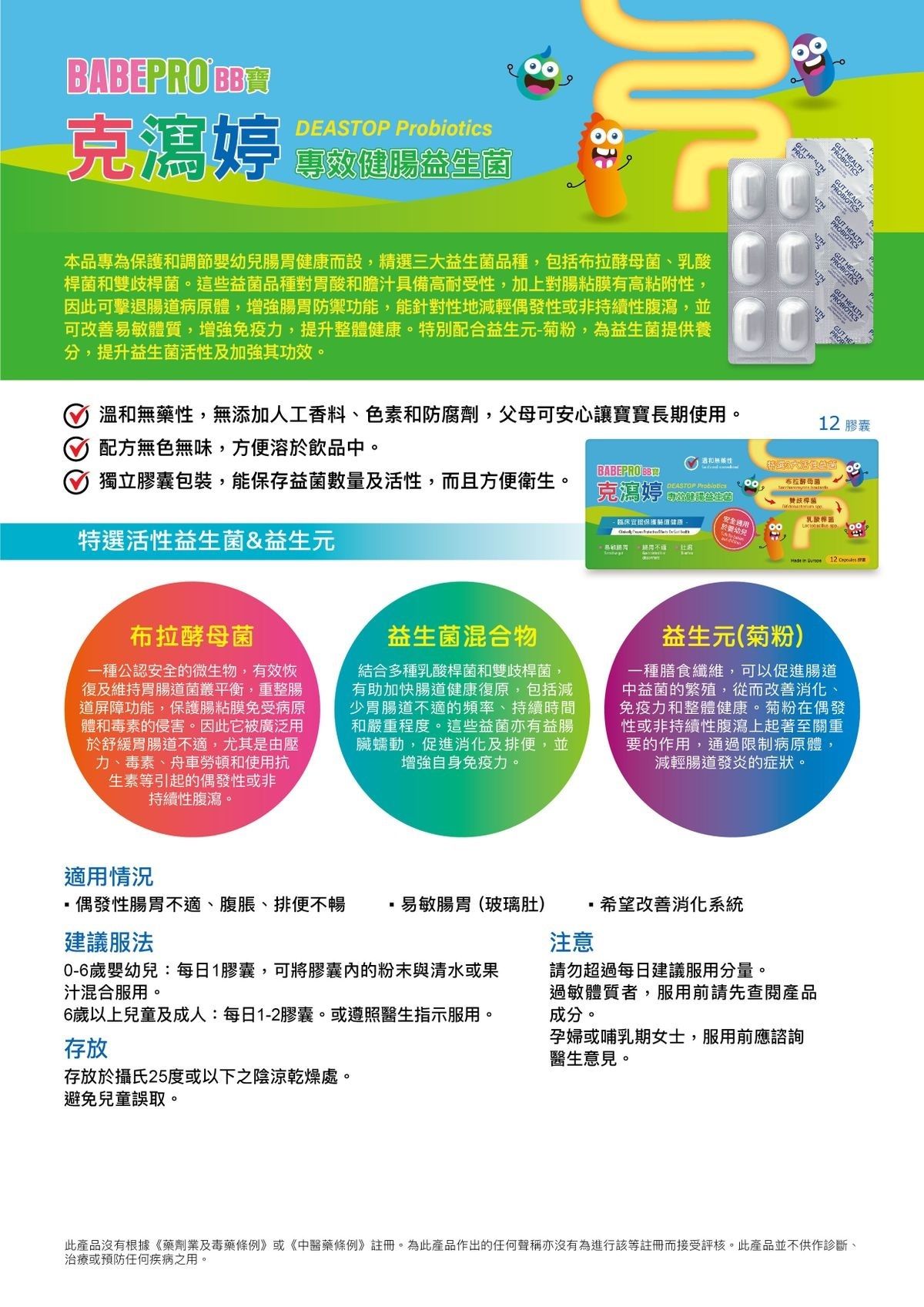本品專為保護和調節嬰幼兒腸胃健康而設,精選三大益生菌品種,包括布拉酵母菌、乳酸桿菌和雙歧桿菌。這些益菌品種對胃酸和膽汁具備高耐受性,加上對腸粘膜有高粘附性,因此可擊退腸道病原體,增強腸胃防禦功能,能針對性地減輕偶發性或非持續性腹瀉,並可改善易敏體質,增強免疫力,提升整體健康。特別配合益生元 - 菊粉,為益生菌提供養分,提升益生菌活性及加強其功效。