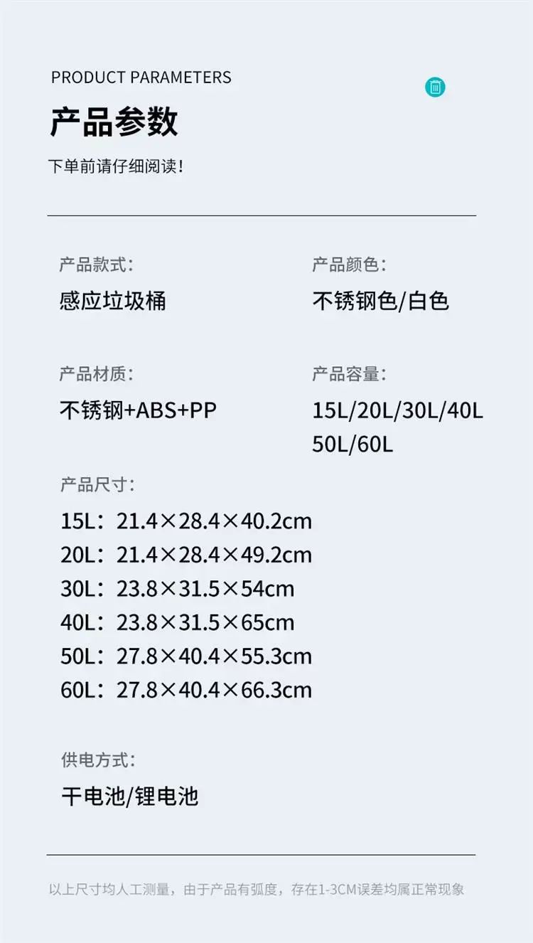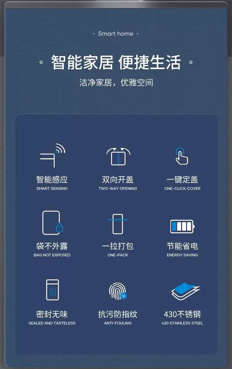 | 商品簡介 | 智能感应式垃圾桶家用带盖厨房客厅办公室自动打包大号大容量商用;;件数:15.0L-自动打包(客厅丨厨房)直;颜色分类:不锈钢(430不锈钢丨加厚材质)顺丰包邮 |