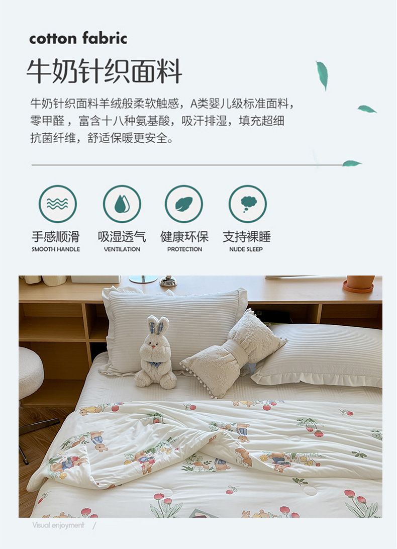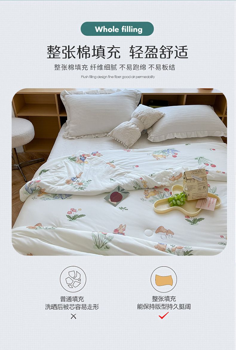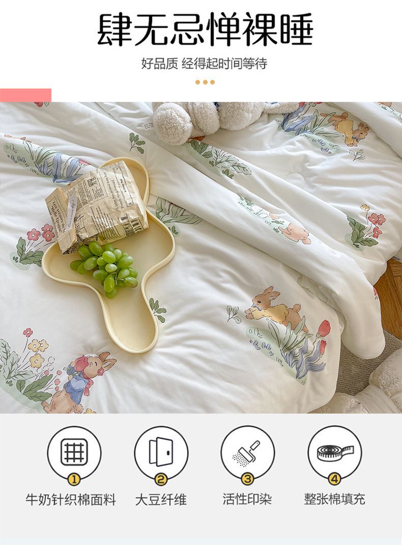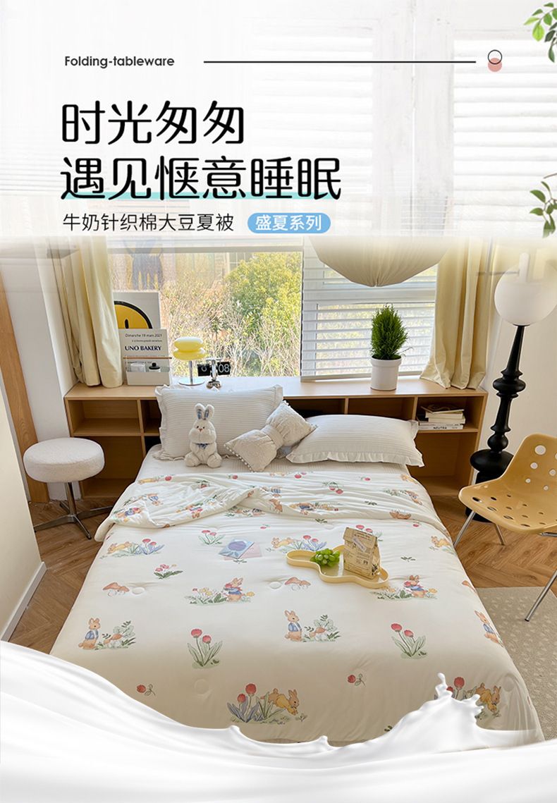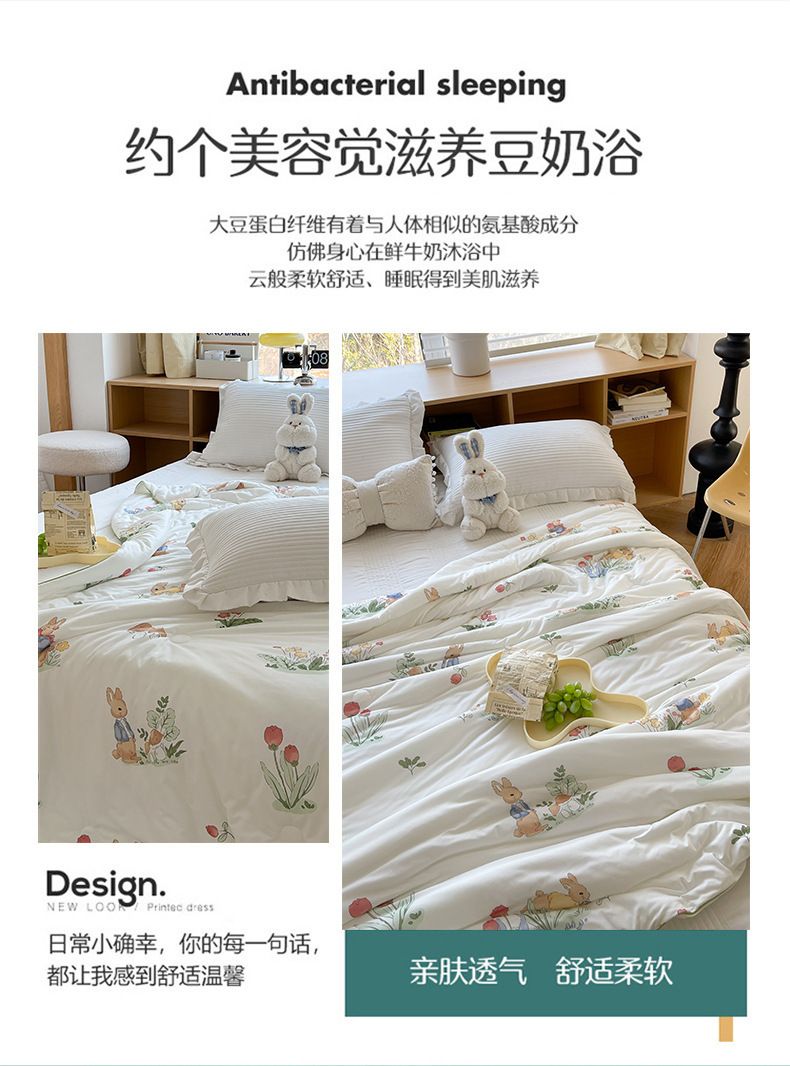 針織棉大豆夏被,A類品質,嬰兒可接觸,孩子舔咬都安全; 牛奶針織面料,零甲醛,吸汗排濕,抗菌纖維,舒適保暖更安全; 大豆蛋白纖維有著與人體相似的胺基酸成分,雲般柔軟舒適、睡眠得到美肌滋養; 整張棉填充,纖維細膩,不易跑棉,不易板結; 活性印染色彩,自然環保色牢度高,顏色靚麗水洗易不褪色。 |