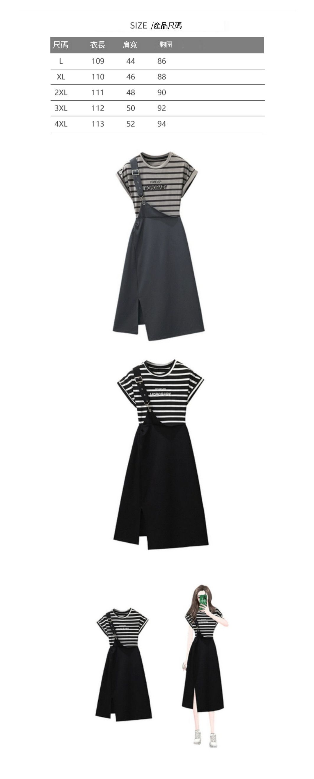 假兩件條紋連衣裙【灰色】【L-4XL碼】(下單後請聯絡客服確認發貨尺碼)