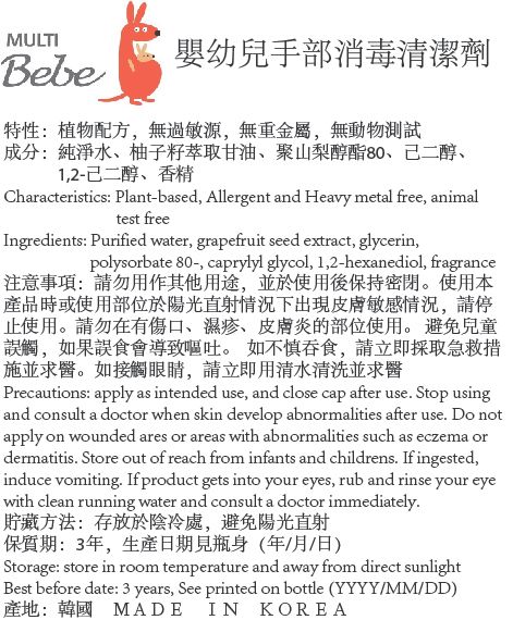 溫和韓方配方,有效消毒抗菌。 含天然精油和植物性提取物成分,用心呵護寶寶的敏感皮膚,保護寶寶成長環境。 植物配方,無重金屬,無動物測試 使用時擠出少量於手中塗匀。 不含酒精 貯藏方法:存放於陰冷處,避免陽光直射。生產日期見瓶身 韓國製造 |