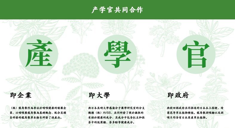 龍角散®有超過200年歷史,是日本家傳戶曉、每個家庭必備的護喉健康品牌,其產品不僅在日本熱賣, 更深受世界各地歡迎。龍角散®主要產品包括最新推出的草本潤®無糖含片(蜂蜜檸檬)、一系列舒緩喉嚨不適的草本潤喉糖、粉劑及其他健康食品例如服藥吞咽輔助果凍系列等,迎合不同消費者需要。