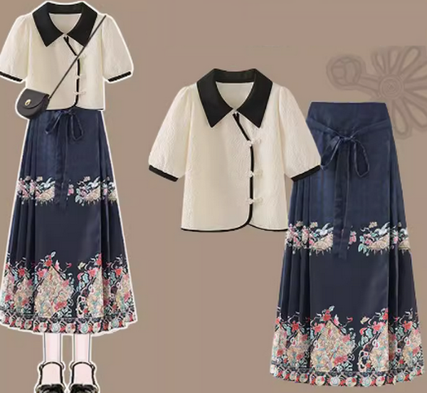 馬面裙夏裝套裝裙女(杏色上衣+藏青色馬面裙S-3XL)(下單後聯絡客服確認發貨尺碼)#F350001219