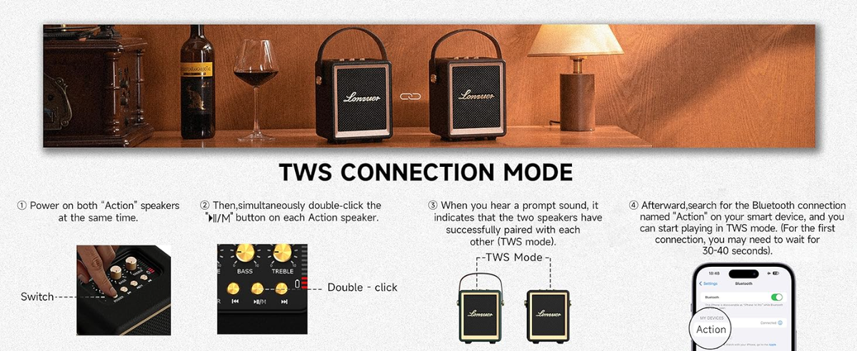 【TWS 無線配對支援】採用無線連接技術,輕鬆將 2 個 Same Action 的便攜式揚聲器連接在一起,達到水晶般清晰的 360° 立體聲,立即為您打造家庭影院或現場音樂會的感覺,享受更好的音樂體驗