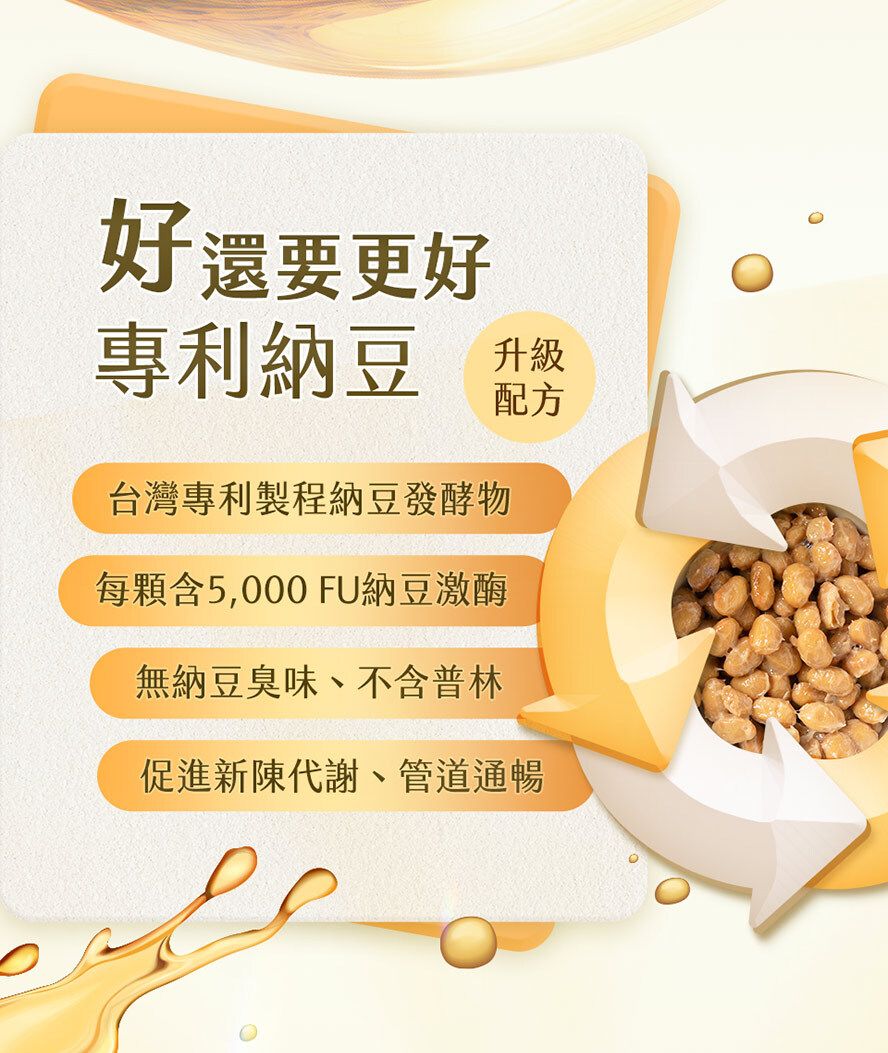 專利納豆+Q10錠 簡介 ***此為升級2.0版本, 原料規格升級,Q10有增量,比舊版更小粒更好吞服 【健康維持 降低負擔】 納豆激酶 高含量的納豆胜肽,為日本人的養生聖品,維持你每日的健康機能。 專利輔酵素Q10 高品質酵母發酵來源,能促進新陳代謝,增加身體能量。 維生素Ex維生素Dx螯合鋅 增進皮膚與血球的健康,有助於維持能量、醣類、蛋白質與核酸的正常代謝。 雙項促代謝成分,清除體內負擔,由內而外鞏固健康。 適合〈銀髮族、熬夜族、應酬族、外食族〉每日補充以調節生理機能。 建議吃法 每天晚餐後1粒;欲加強保養者可於晚餐後食用2粒。 **此產品或有助於穩定血脂/膽固醇。 |