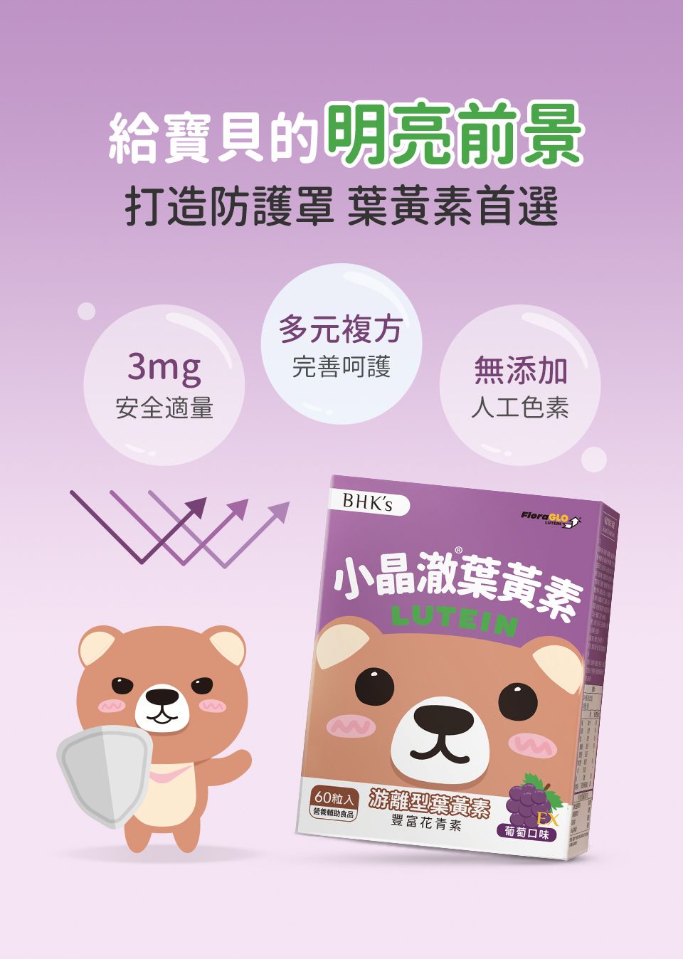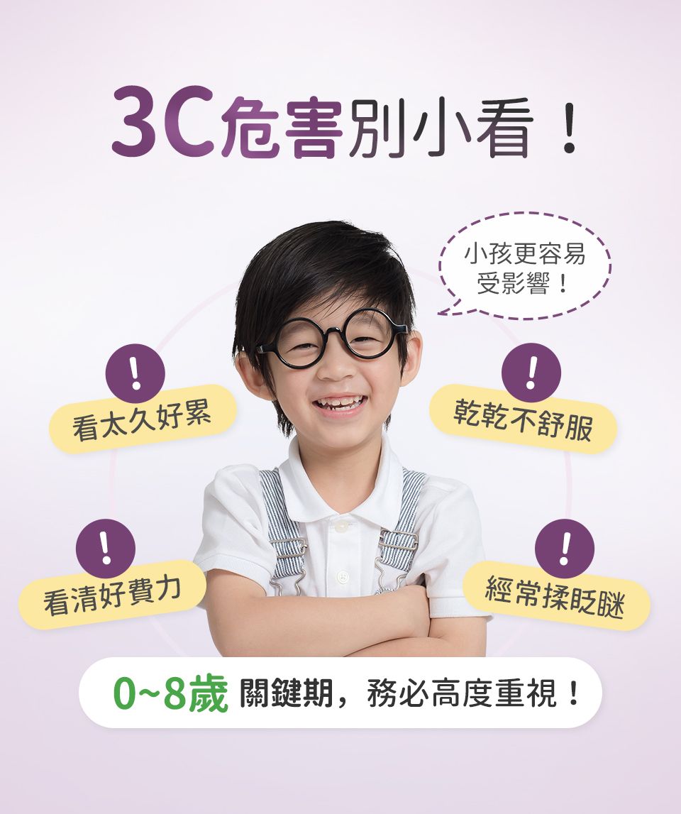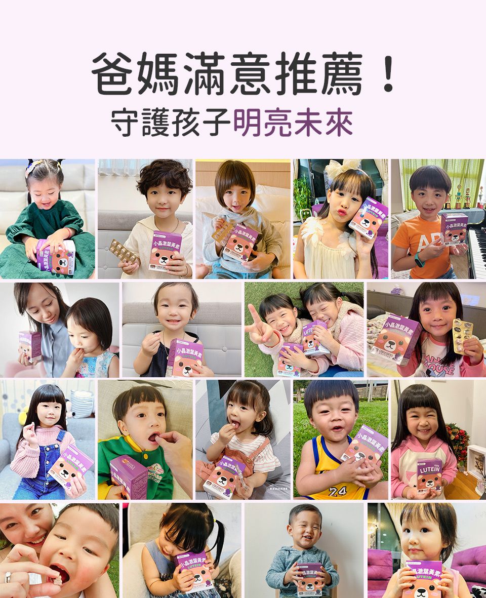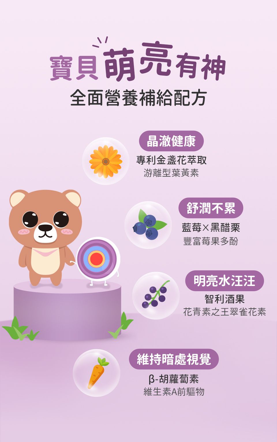 4大亮眼成分為兒童量身打造的葉黃素,保護孩子視力: 1. 專利金盞花萃取:美國葉黃素,游離型態好吸收,保護孩子視力最好的葉黃素 2. 智利酒果:含有最高等級花青素「翠雀花素」,有效滋潤眼睛 3. 藍莓x黑醋栗:豐富莓果多酚,讓孩子不再感到眼睛酸澀 4. β-胡蘿蔔素:最安全的維生素A前驅物,有助於維持暗處視覺。 |