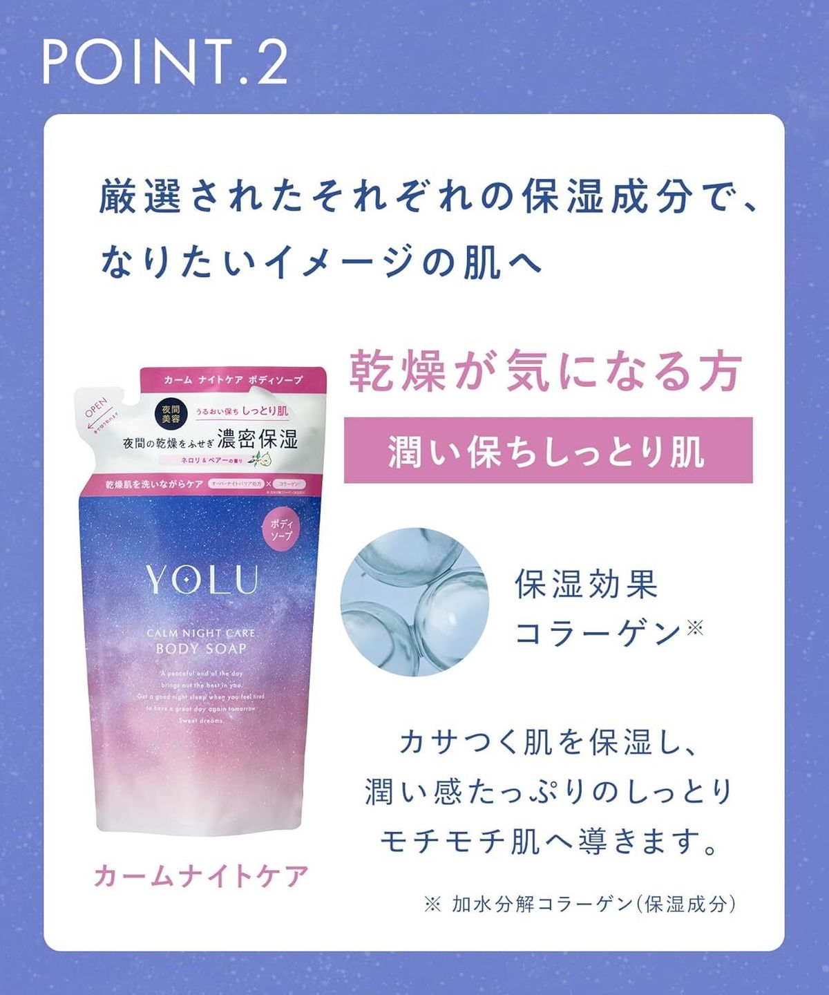 YOLU 夜間滋潤沐浴露︰ ① 晚間修復補水配方,以牛乳提取物及乳糖加強角質層保濕力,鎖住水分,保持整夜滋潤。 ② 配合合歡木精華及膠原蛋白,修復乾燥肌膚。 ③ 綿密芳香泡沫,柔軟舒適,富有高級感的護膚體驗。 ④ 天然無添加配方,不含Paraben 防腐劑、礦物油、人工色素及硫酸鹽等等。