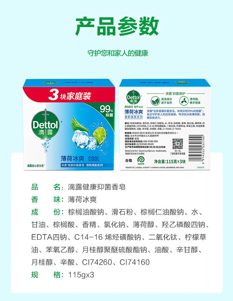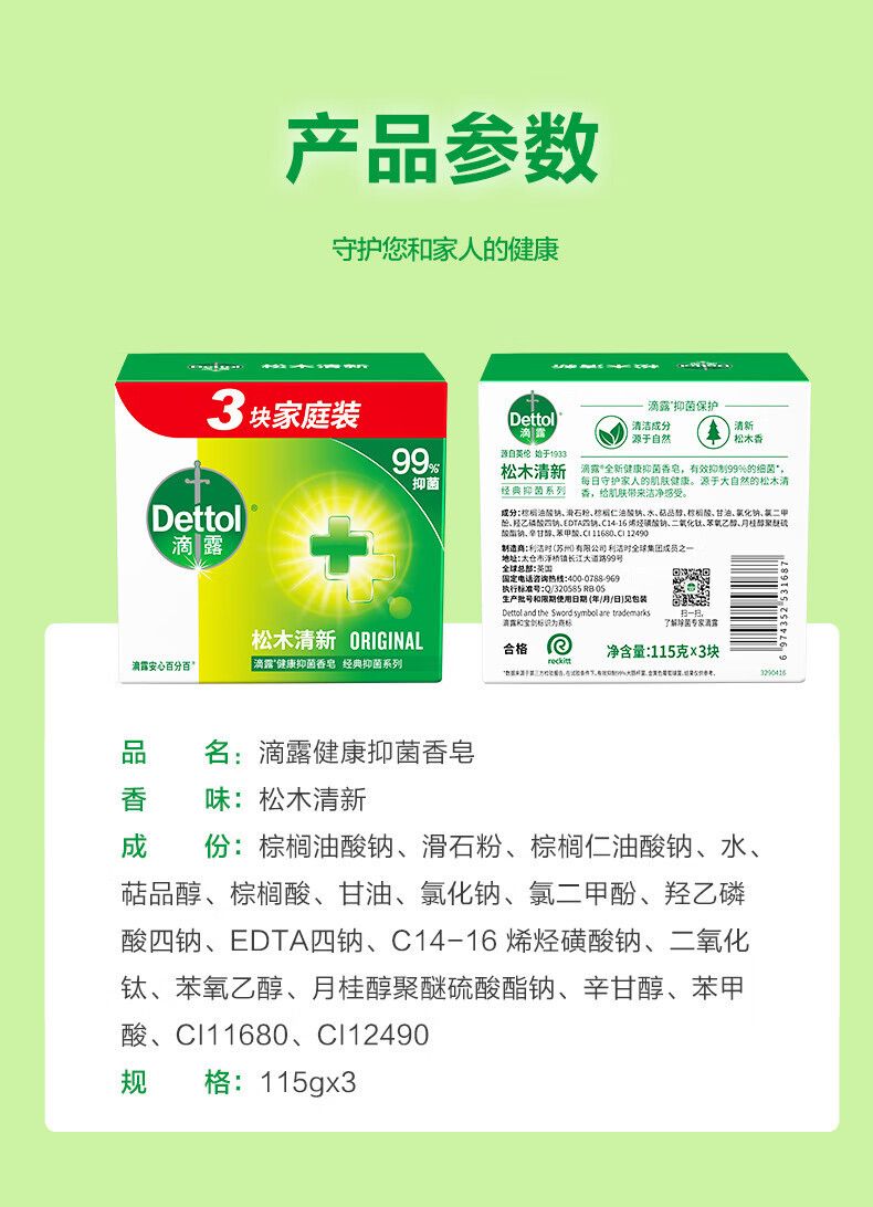 | 商品簡介 | 滴露健康抑菌香皂松木清新115克*3现货供应混批量大从优正品保证;115g;水果香 |