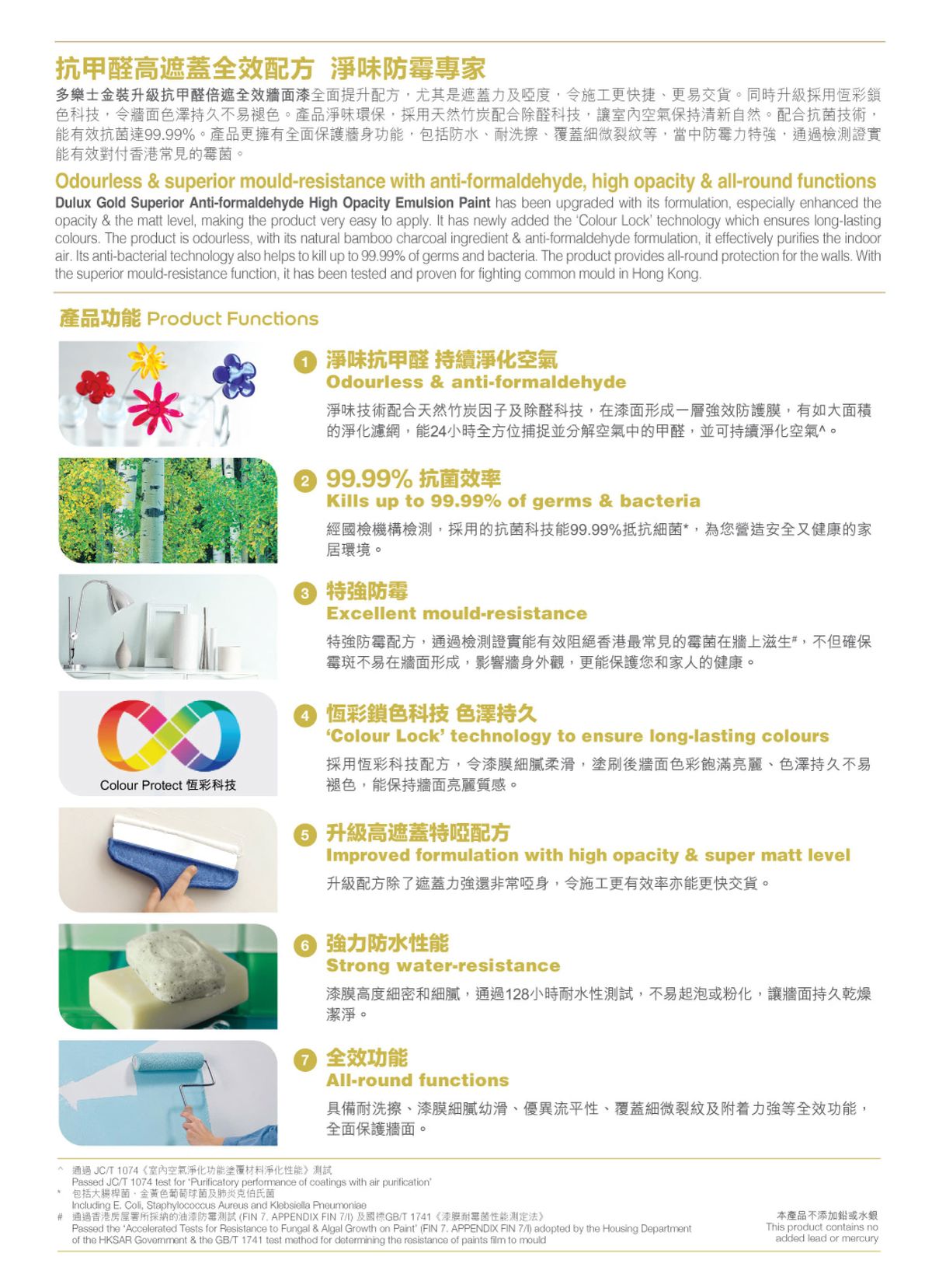 | 商品簡介 | 多樂士「金裝升級抗甲醛倍遮全效」牆面漆全面提升配方,尤其是遮蓋力及啞度,令施工更快捷、更易交貨。同時升級採用恆彩鎖色科技,令牆面色澤持久不易褪色。淨味環保,採用天然竹炭配合除醛科技,有效捕捉並淨化游離在空氣中的甲醛,保持空氣清新自然。配合抗菌科技,能99.99% 抵抗細菌。更擁有全面保護牆身功能,當中以防霉力特強,經測試能有效對付香港常見的霉菌。 |