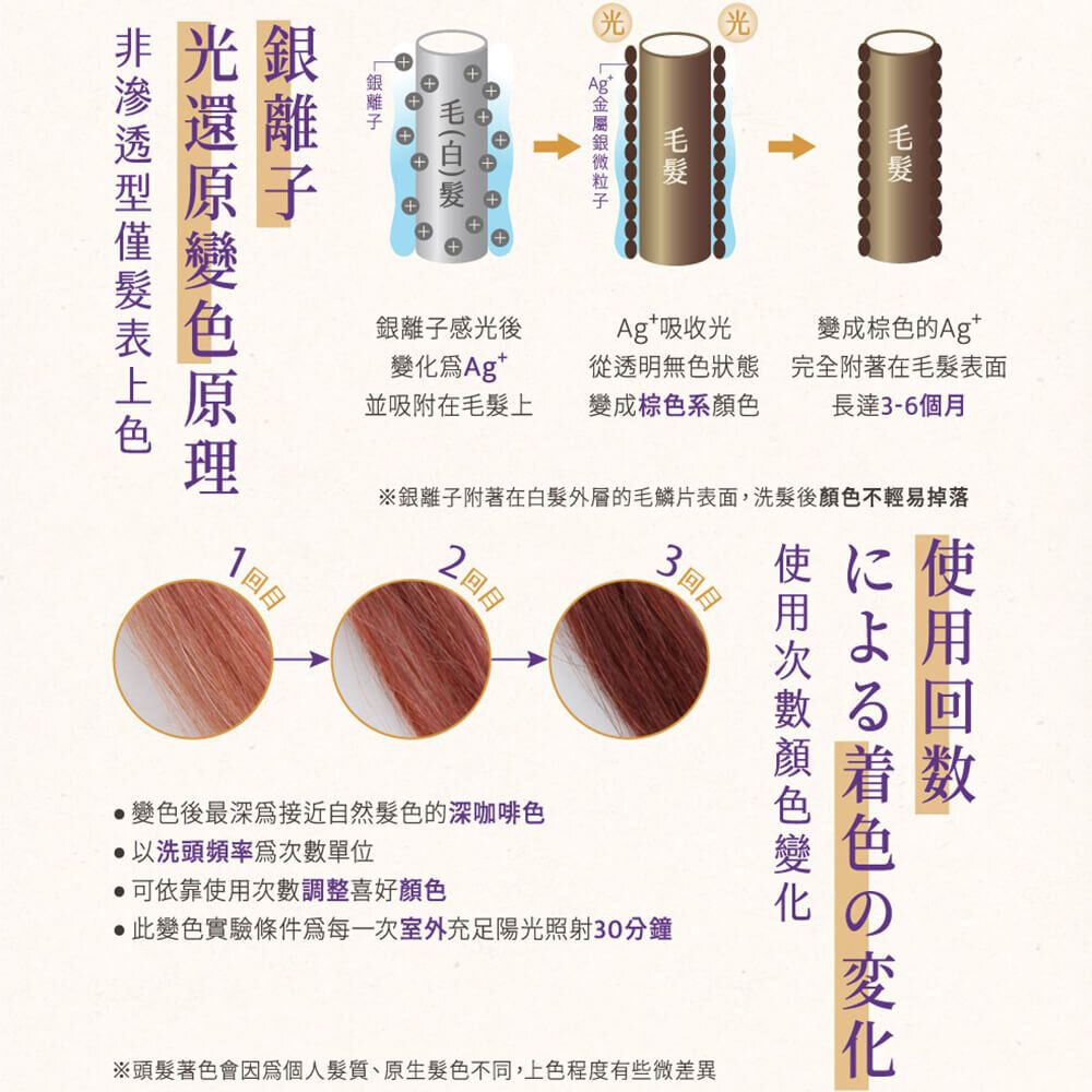 A:光彩護汝髮沒有添加色素色料,因此只有一種顏色可以選擇。僅運用銀離子物理性感光變色的特性,銀離子感光變色後會從透明的顏色變成接近自然髮色的咖啡色。