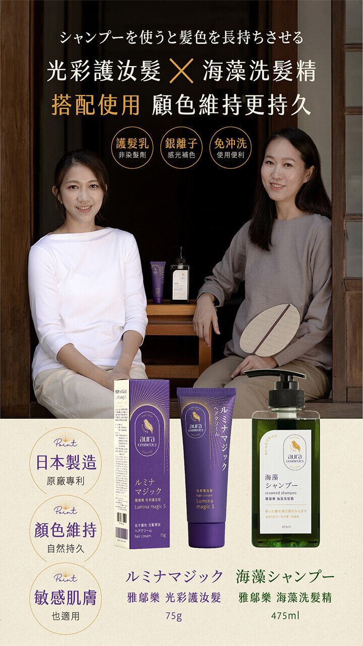 可以搭配aura雅鄔樂日本原廠研發室,專為光彩謢汝髮及台灣海島型氣候所量身訂做的海藻洗髮精,使用光彩護汝髮後已經定色的時間可以維持大約3-6個月的定色時間。