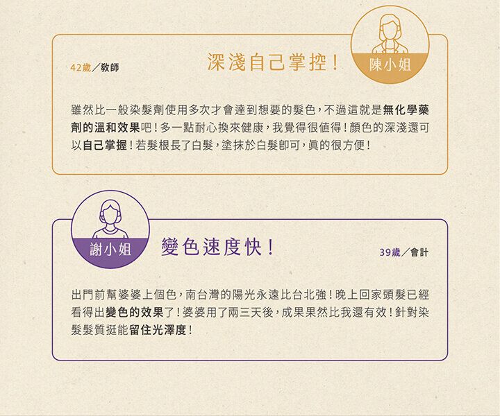 ➤ 【非含藥化妝品】不含PPD、阿摩尼亞、重金屬、過氧化氫 等化學藥劑添加,成份溫和植萃安心。