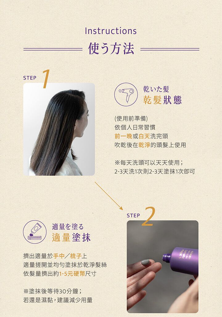 A:光彩護汝髮本身是免沖洗的護髮乳,質地水嫩清爽。塗抹的用量和用法也和免沖洗的護髮乳相同,薄薄一層即可,塗抹後約30-40分鐘頭髮會逐漸清爽,如果塗抹後一小時仍覺得油膩,建議下一次使用減少用量。
