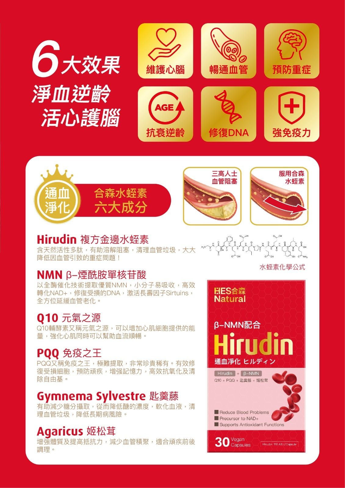 Hirudin 水蛭素 - 含天然活性多肰,有助預防阻塞,清理血管垃圾保持暢通無助,大大降係因血管所引致的重症問題。