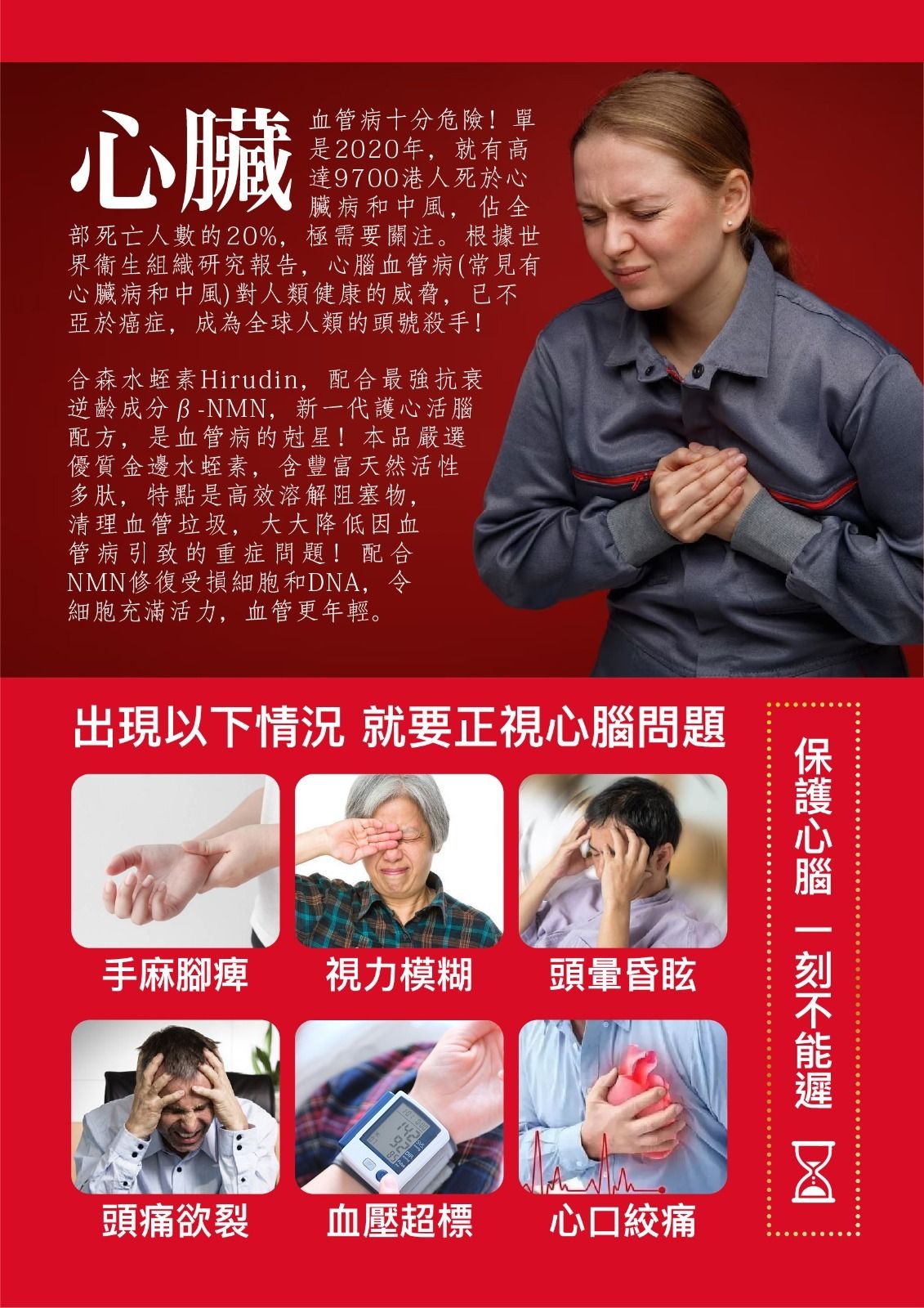 【 適用人士 】 .工作忙,缺乏休息壓力大的上班族 .關注糖尿病,心腦血管疾病或中風人士 複方配方包含水蛭素 + β-NMN + Q10 + PQQ + 匙𡙡騰 + 姬松茸,專為港人需要而設,容易吸收。保護心腦血管健康,提高免疫力,恢復血管活力,改善微循環。 產品榮獲多項品質安全認證,更有香港優質正印,是你信心之選! 卸責聲明 此產品沒有根據《藥劑業及毒藥條例》或《中醫藥條例》註冊。為此產品作出的任何聲稱亦沒有為進行該等註冊而接受核。此產品並不供作診斷、治療或預防任何疾病之用。” |