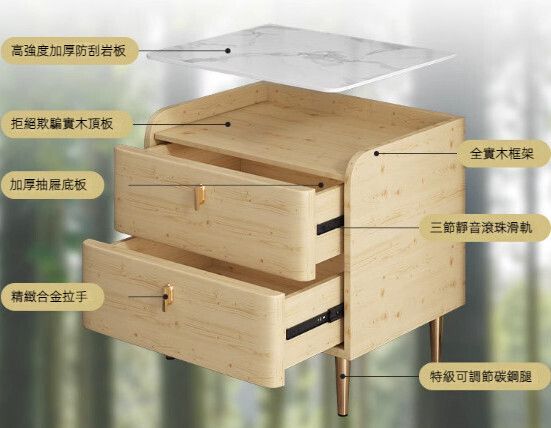 | 商品簡介 | 全實木岩板床頭櫃(雙層香檳灰+金)(尺寸:長50x寬40x高50cm) |