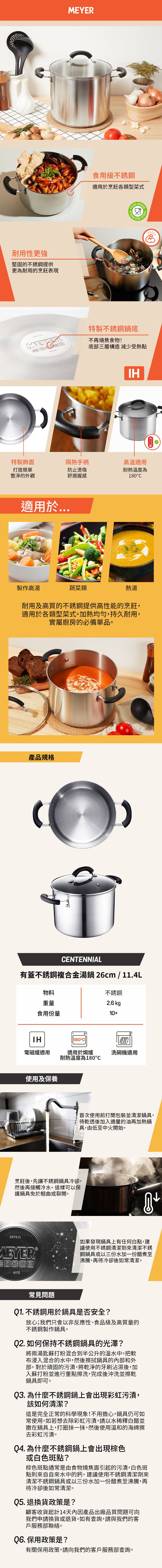 (電磁爐適用) 26cm/11.4L 不銹鋼湯鍋連蓋 - Centennial ● 防滴漏卷邊鍋身設計,輕鬆倒出湯汁 ● 堅固手柄設計,放心把湯鍋移至餐枱 ● 強化玻璃蓋附耐熱蓋柄 ● 內外精鋼打磨 耐磨防刮 ● 三層特厚堅固底部,導熱均勻 ● 耐高溫手柄 |