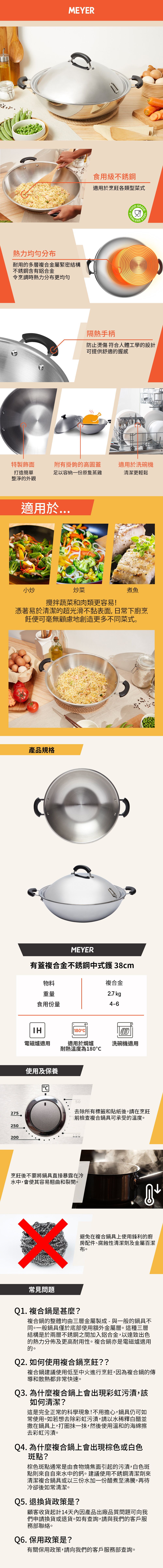 38cm/9.4L 不銹鋼複合金中式鑊連蓋 ● 清洗方便 ● 電木手柄,耐高溫防燙 ● 適用於洗碗碟機 ● 適用於任何爐具,包括電磁爐 |
