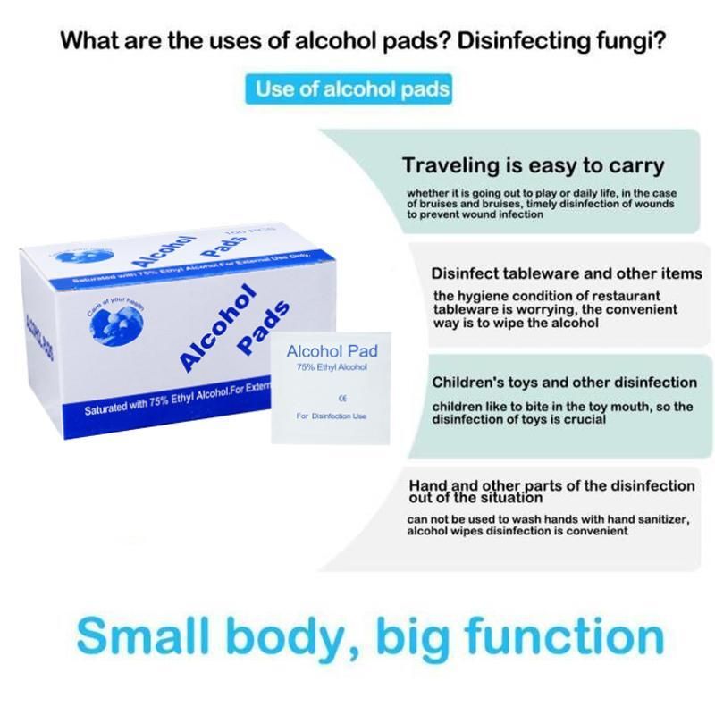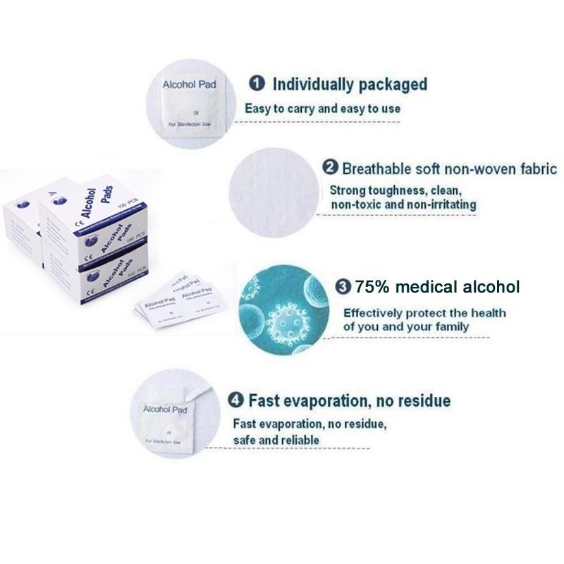 居家外出必備 - 75%酒精成分,快速強效殺菌、消毒、安全、溫和、無刺激。適用於皮膚清潔,注射前消毒,個人物品及玩具等清潔、殺菌消毒。單片獨立鋁紙包裝,方便使用及攜帶。 使用產品擦拭、消毒後約30秒即完全揮發、無殘留 單片獨立包裝 單片產品尺寸:3 x 6 cm,外盒尺寸:10.2x5.5x5.5 cm 成分:75% 酒精 包裝:每盒100片 注意事項: 1. 僅供外用。 2. 單片一次性使用。 3. 避免接觸眼睛,請將本產品放在兒童不能接觸的地方。 4. 如果發生皮膚刺激,請停止使用。 使用方法:撕開包裝,取出棉片。